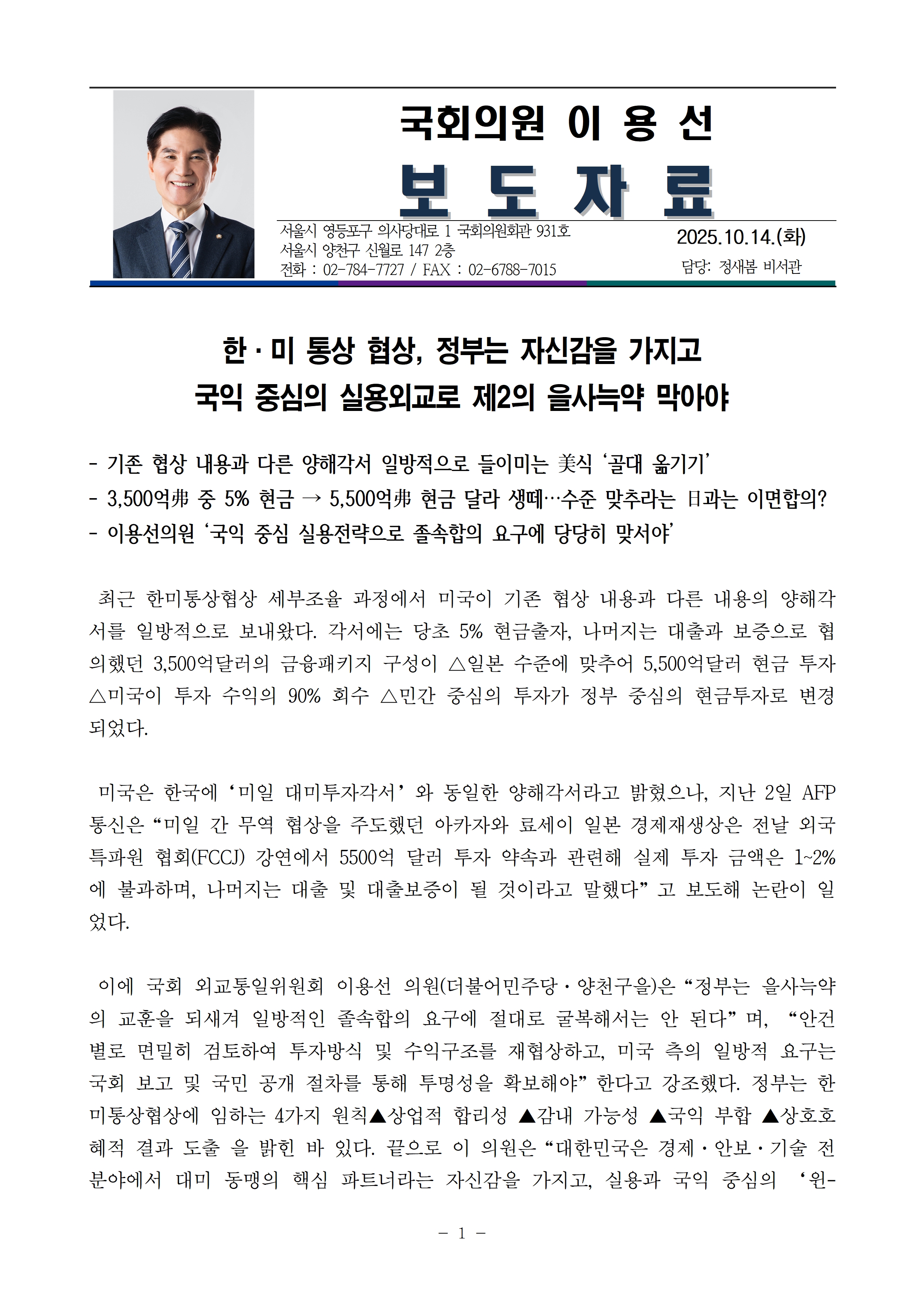 보도자료_251014_이용선의원_한미통상협상_제2의을사늑약막아야 .hwp