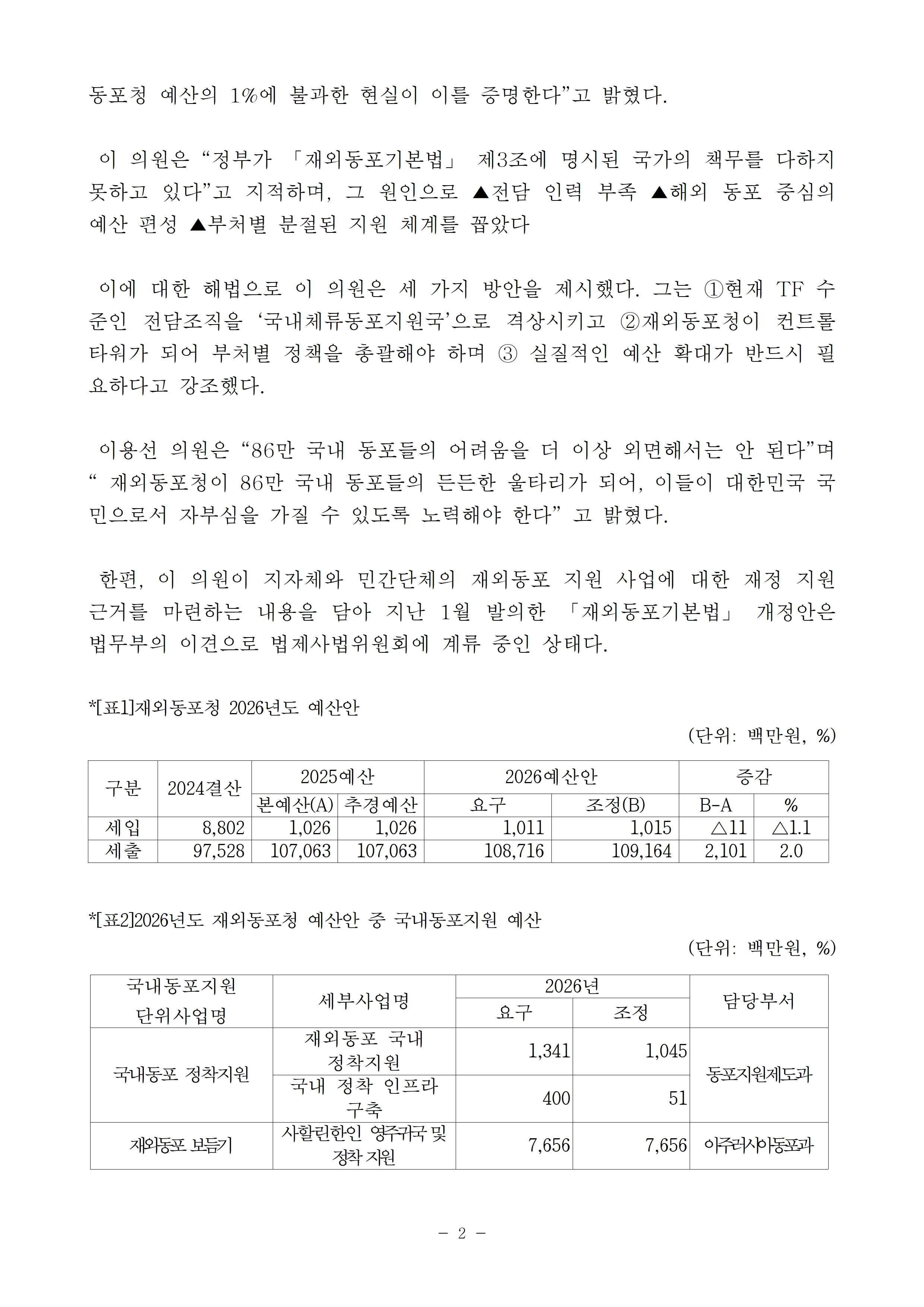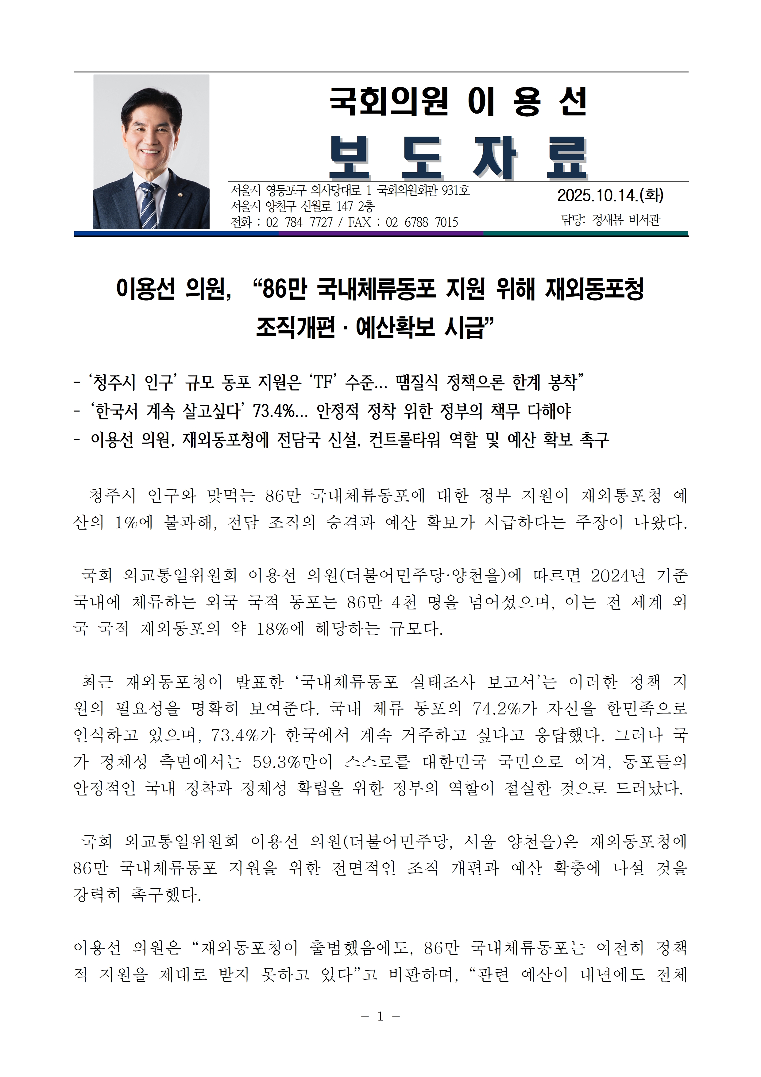 [이용선 국회의원 보도자료] 이용선 의원, “86만 국내체류동포 지원 위해 재외동포청 조직개편·예산확보 시급”