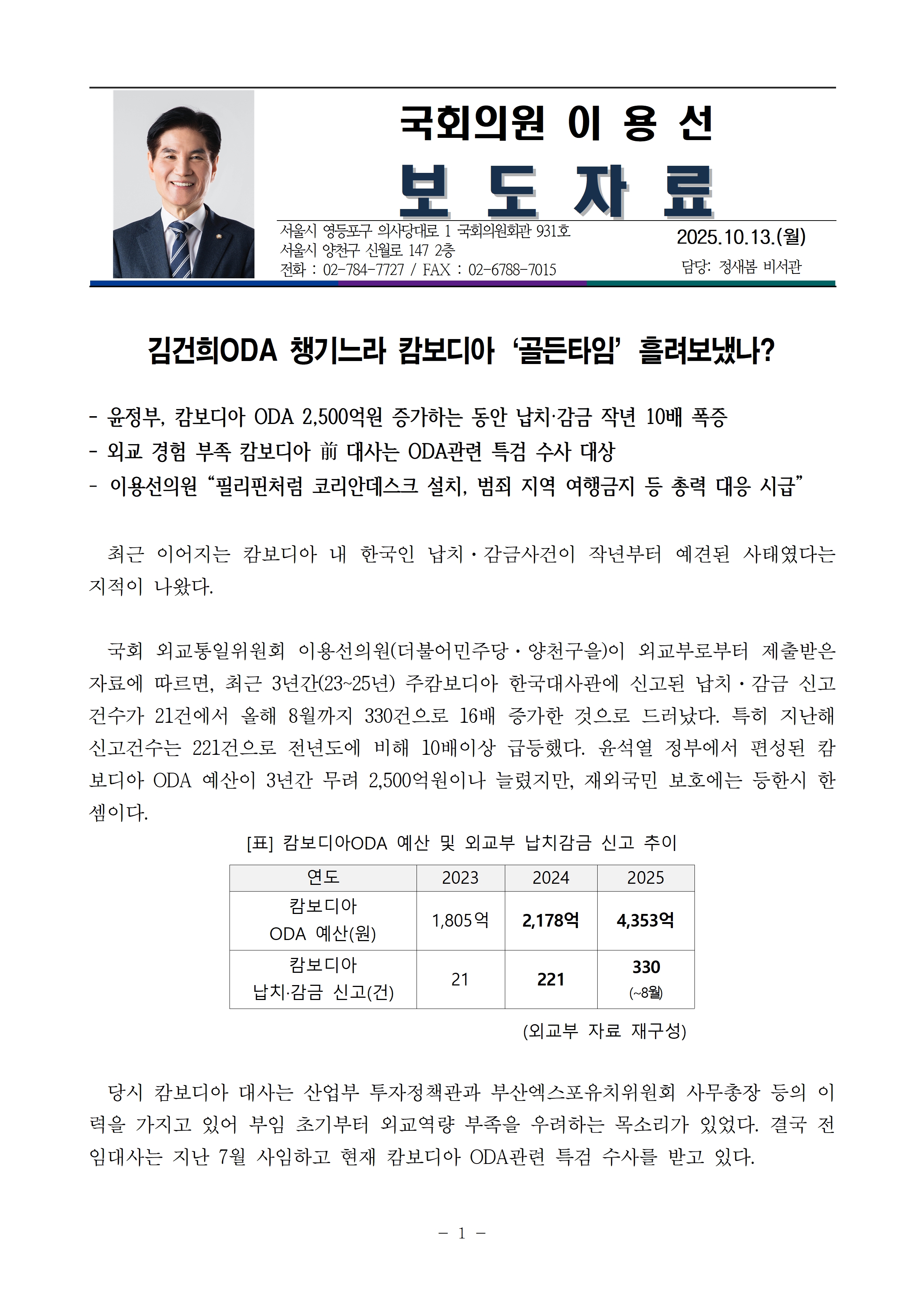 보도자료_251013_이용선의원_김건희ODA 생기느라 캄보디아 골든타임 흘려보냈나.hwp