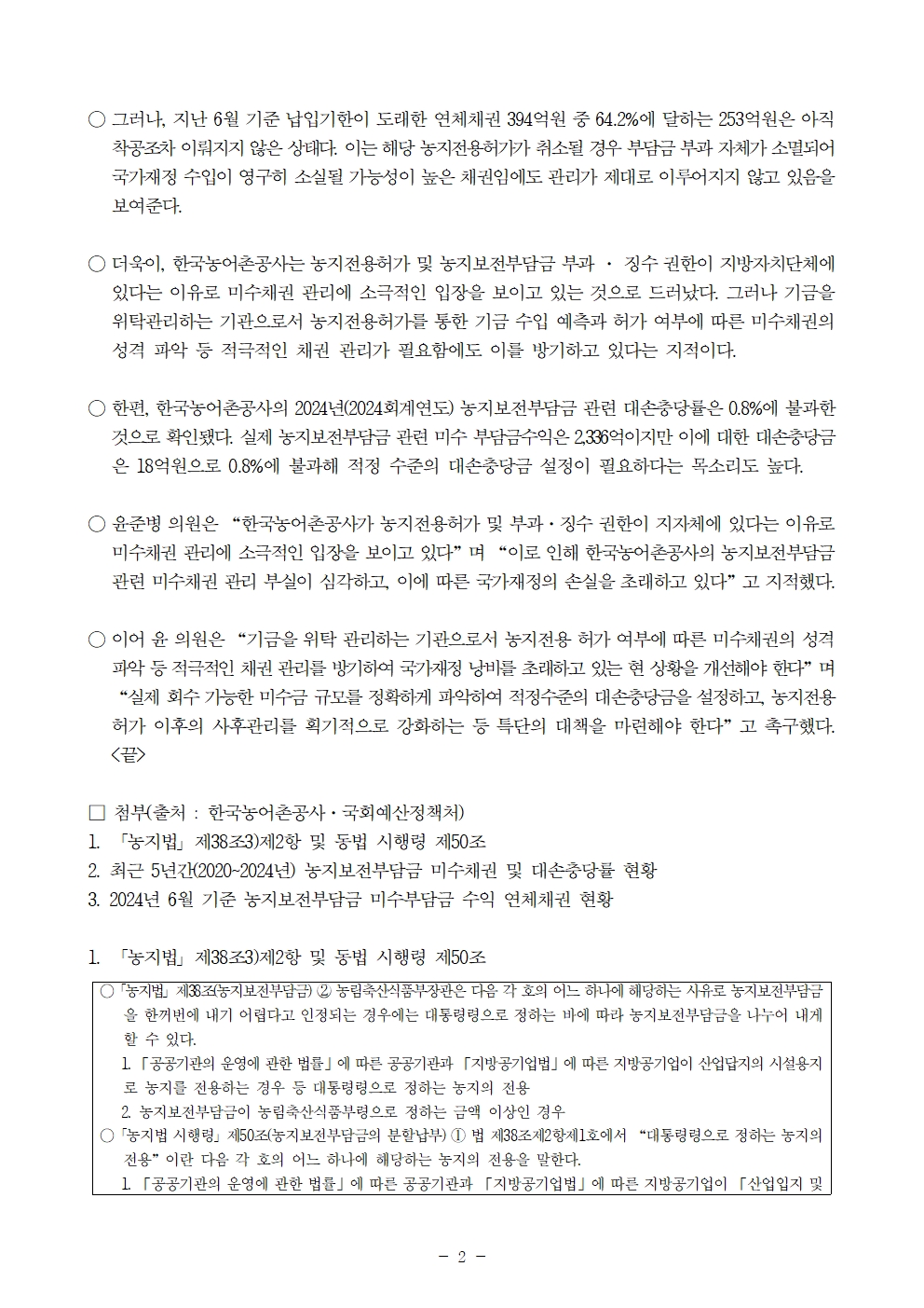 251017 [윤준병 의원 국정감사 보도자료] 농어촌공사 농지보전부담금 미수채권 5년 새 800억·52% 급증.hwp