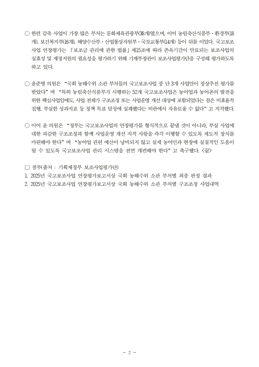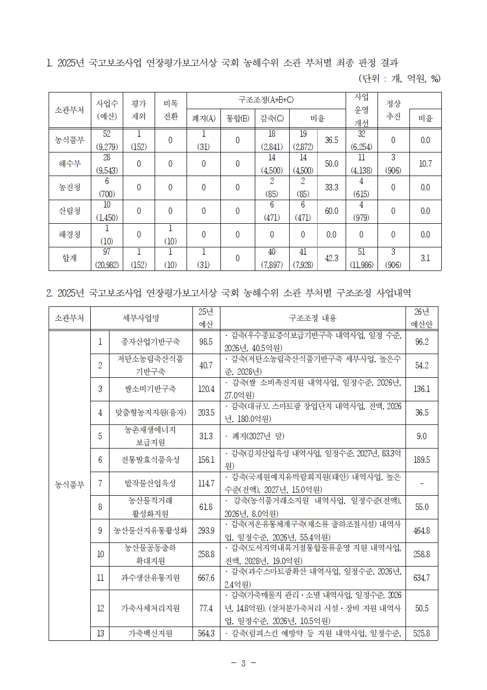 251019 [윤준병 의원 국정감사 보도자료] 2조 규모 농해수위 소관 97개 국고보조사업 중 정상추진사업은 단 3%.hwp