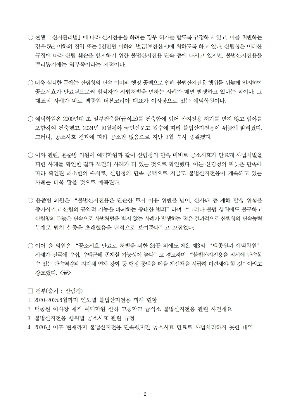 251020 [윤준병 의원 국정감사 보도자료] 불법산지전용 공소시효 만료로 처벌 피한 ‘제2의 백종원·예덕학원’ 수두룩.hwp