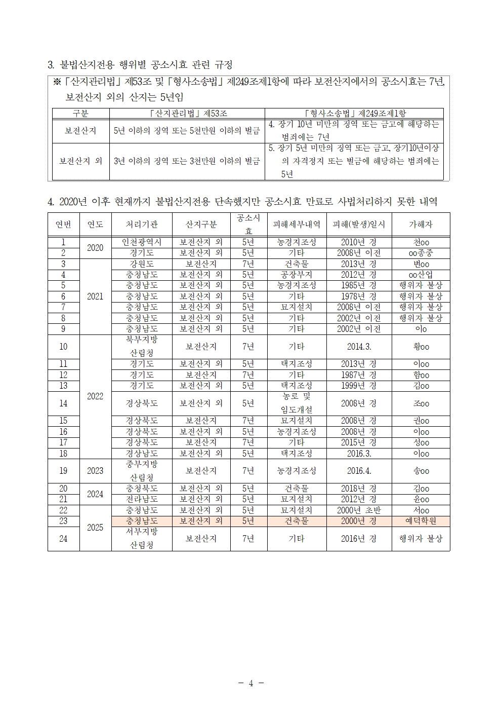 [윤준병 의원 국정감사 보도자료] 불법산지전용 공소시효 만료로 처벌 피한 ‘제2의 백종원·예덕학원’ 수두룩
