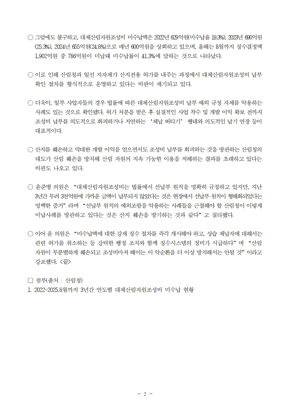 251020_[윤준병_의원_국정감사_보도자료]_최근_3년간_대체산림자원조성비_미수납액만_2_760억_달해001.jpg