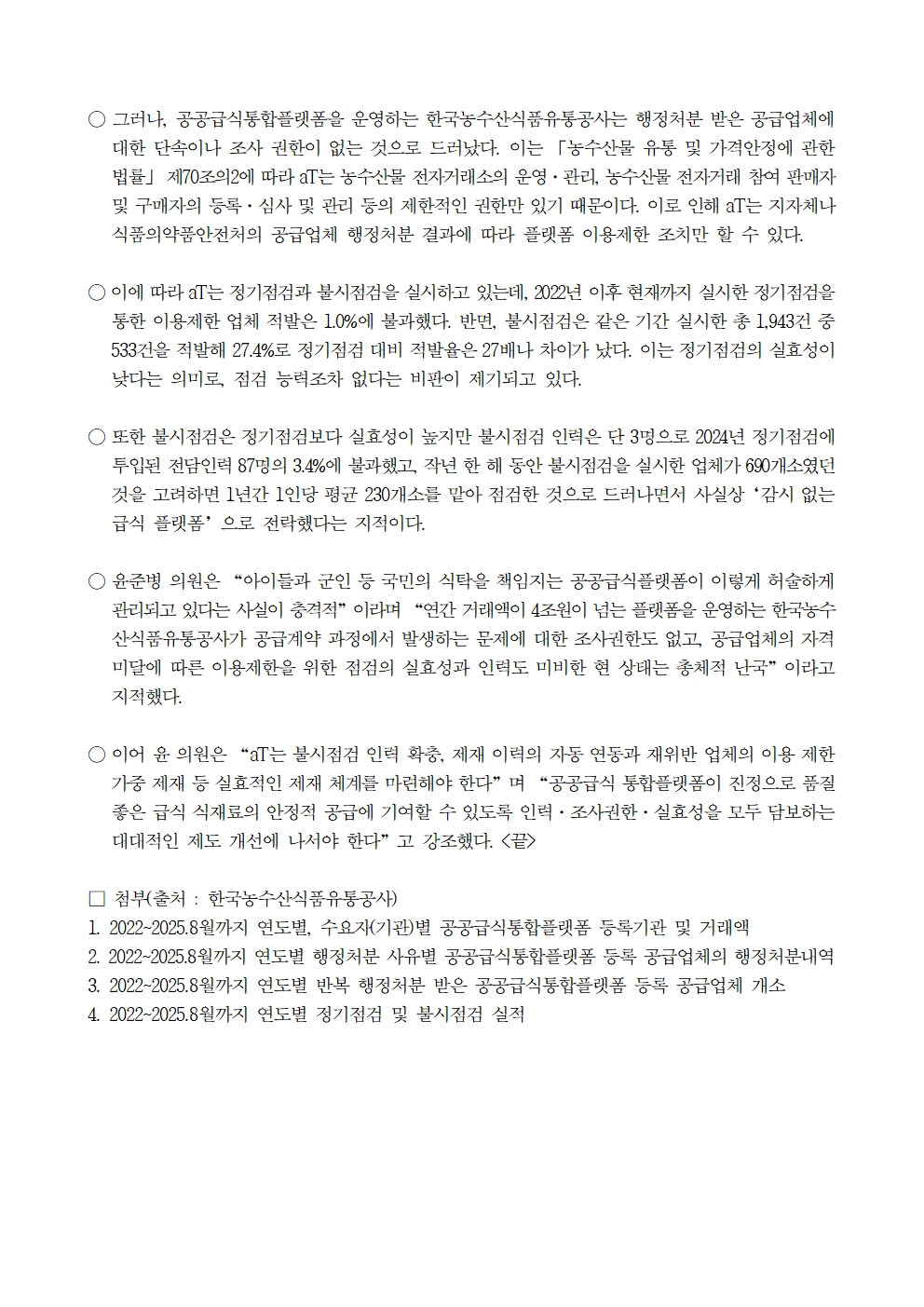 [윤준병 의원 국정감사 보도자료] 4조원 규모 aT 공공급식 통합플랫폼, 권한도·능력도 없는 총체적 부실 심각!