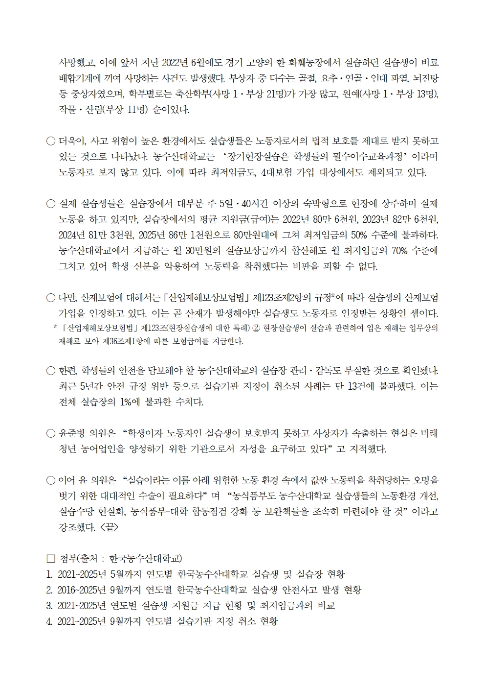 251021 [윤준병 의원 국정감사 보도자료] 한국농수산대 교육 빙자한 ‘위험노동’...10년간 현장실습서 52명 사상.hwp