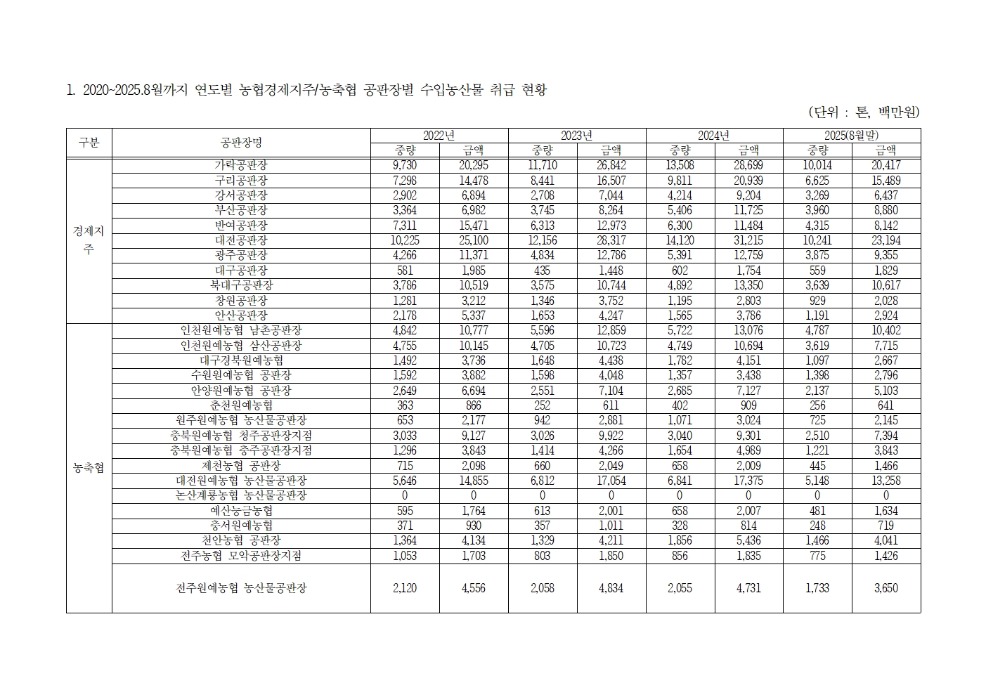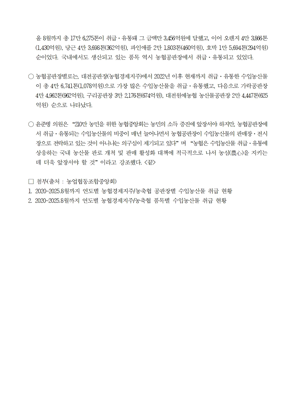 251024 [윤준병 의원 국정감사 보도자료] 지난 3년간 농협공판장서 수입농산물 44만톤·1조원 넘게 유통.hwp