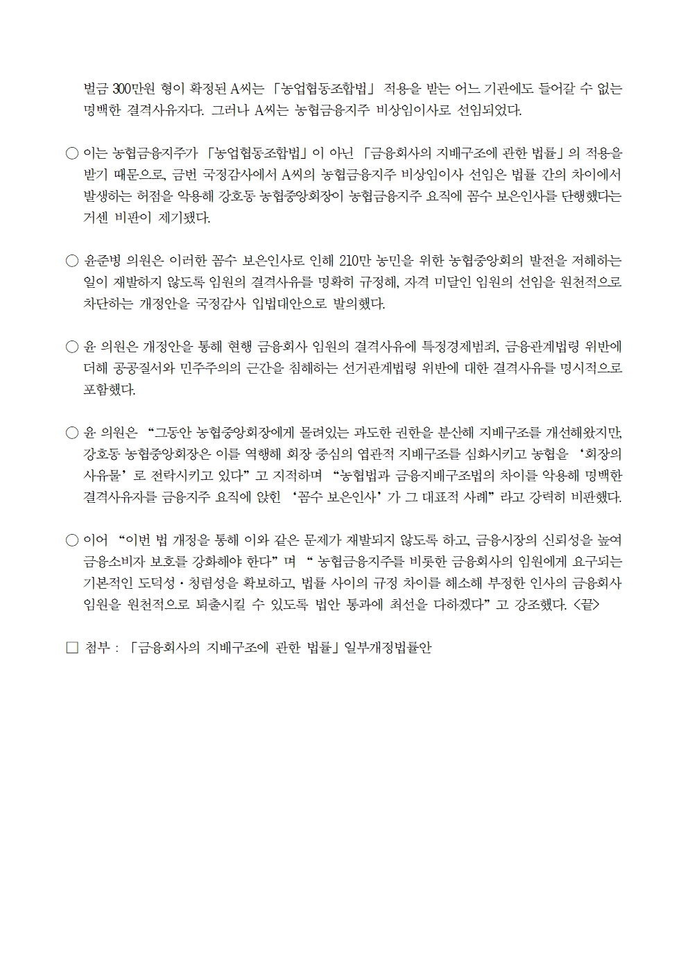251029 [윤준병 의원 국정감사 보도자료] 윤준병 의원 ‘농협금융지주 임원 결격사유 강화법’ 대표 발의!.hwp