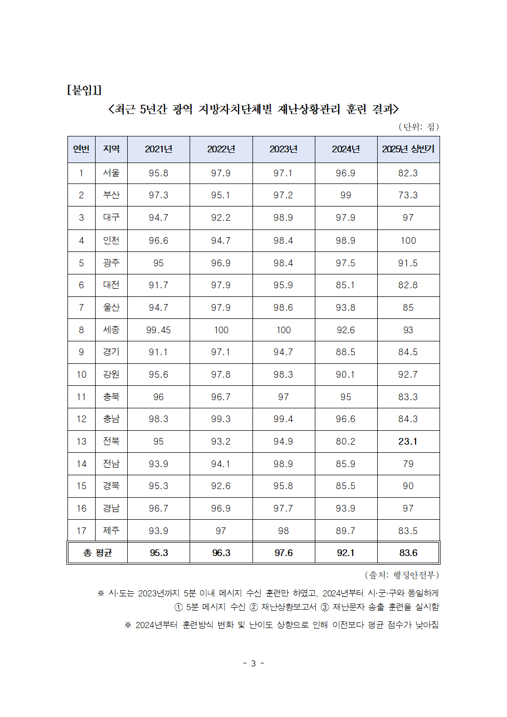 - 광역별 재난상황관리 훈련 점수 전국 평균 202397.6점에서 2025년 상반기 83.6점으로 하락세
