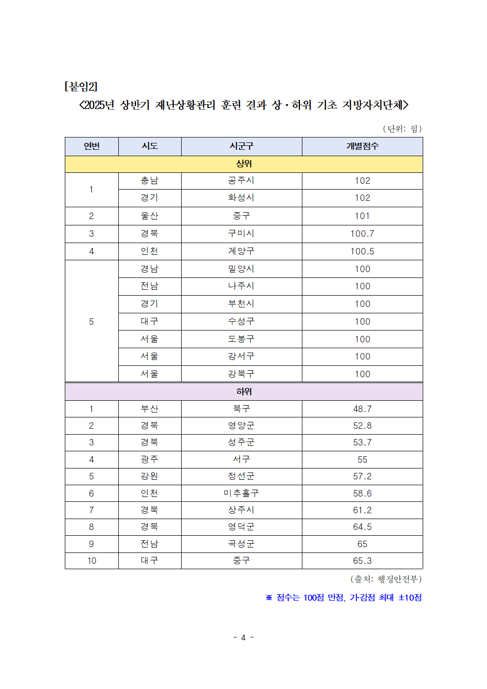 [국회의원 한병도 2025 국정감사 보도자료] 올 상반기 재난상황관리 훈련 전북 23점 최하위... 시군구별 격차도 커