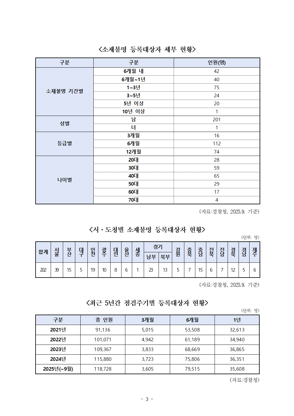 소재불명 기간 1~3년 75명, 3~5년 24명, 5년 이상 20명, 10년 이상도 1명 존재해