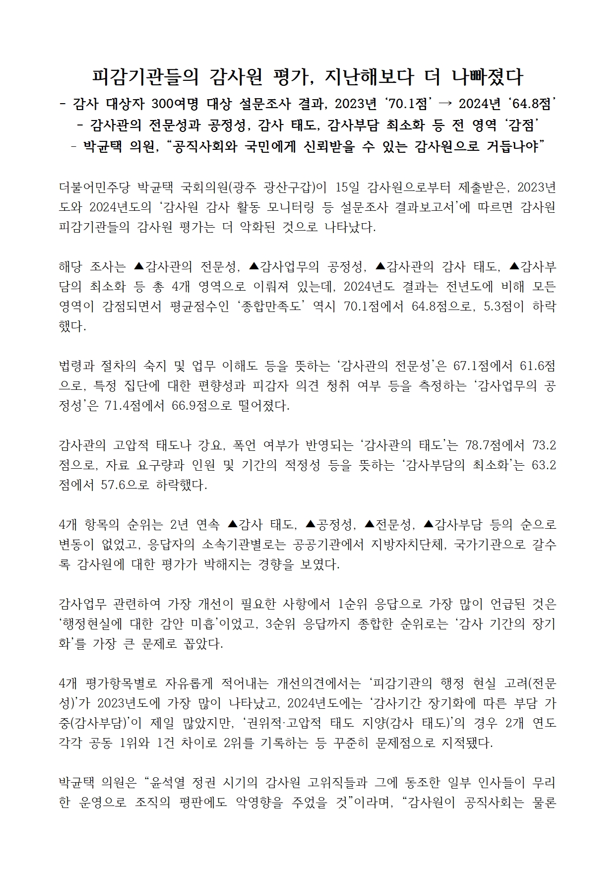 [박균택 의원 국정감사 보도자료] 피감기관들의 감사원 평가, 지난해보다 더 나빠졌다