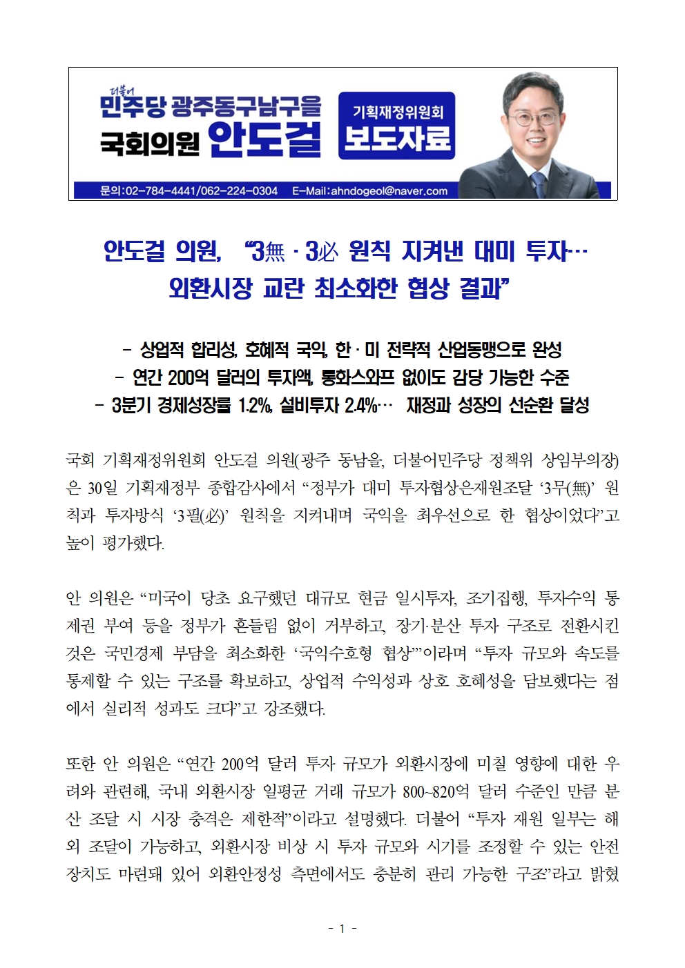 [국회의원 안도걸 보도자료] “3無·3必 원칙 지켜낸 대미 투자…외환시장 교란 최소화한 협상 결과