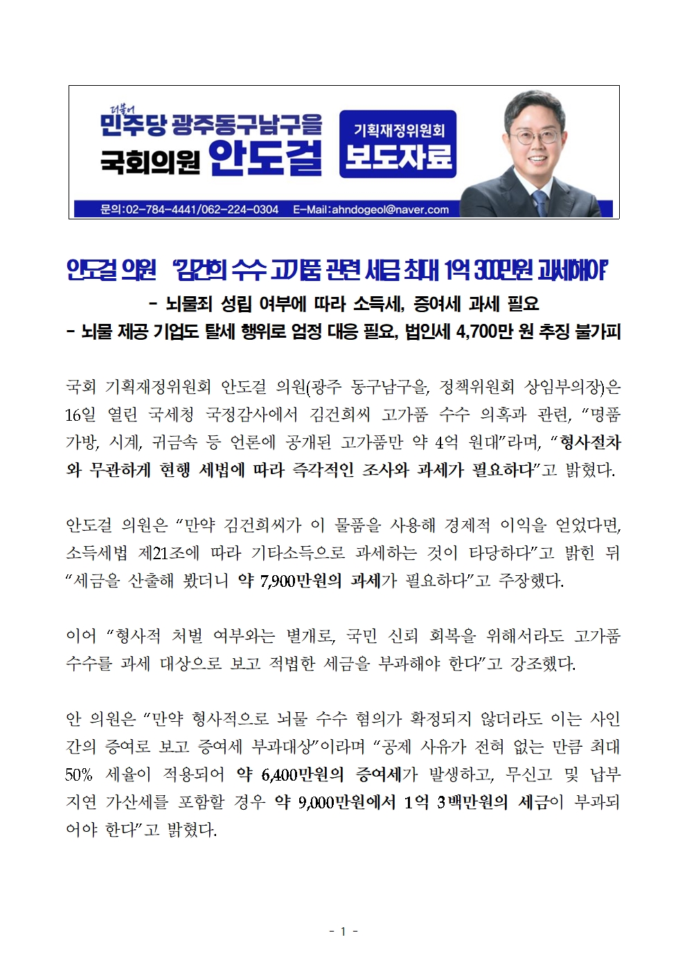 [국회의원 안도걸 보도자료] 김건희 수수 고가품 관련 세금 최대 1억 300만원 과세해야.hwp