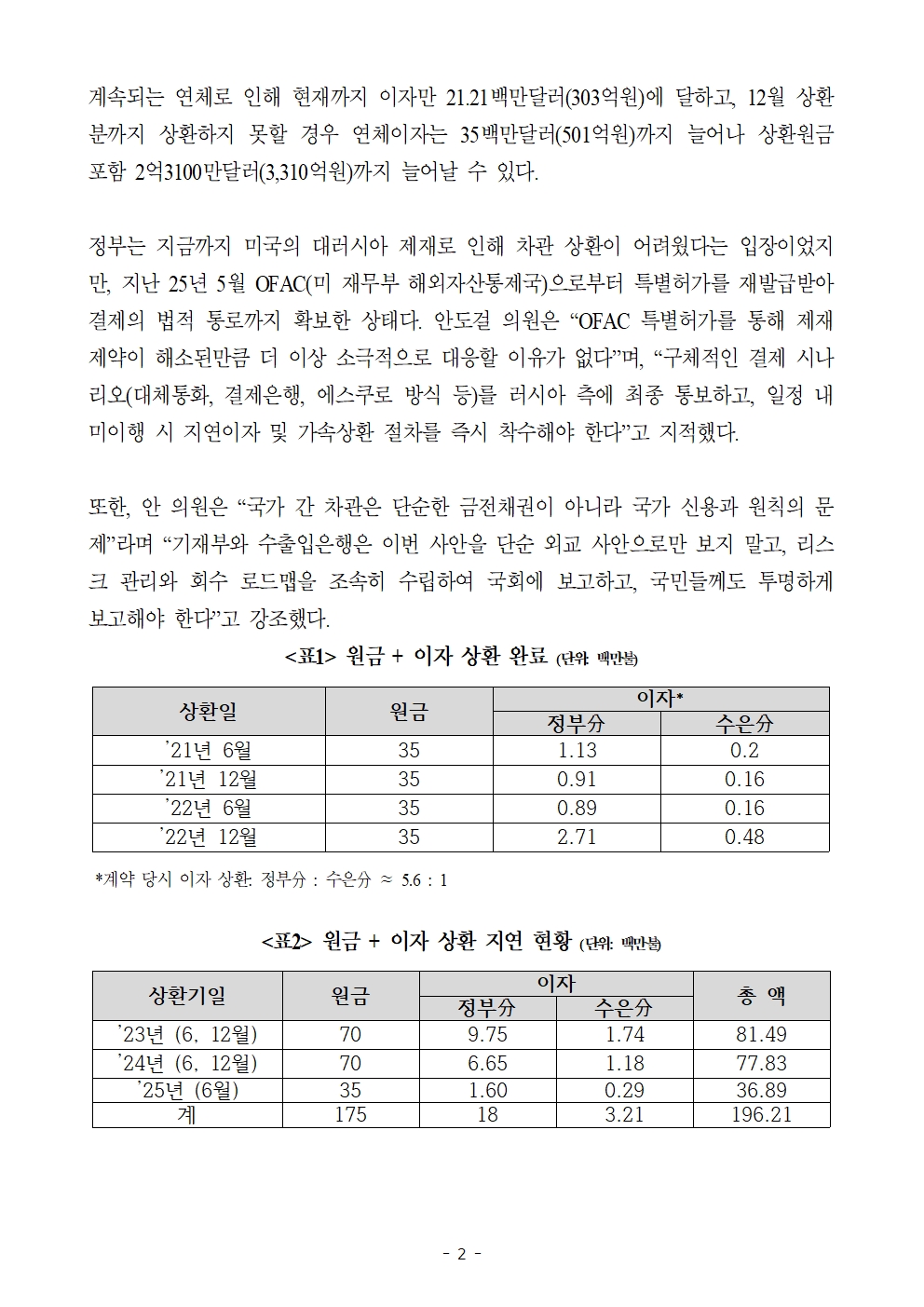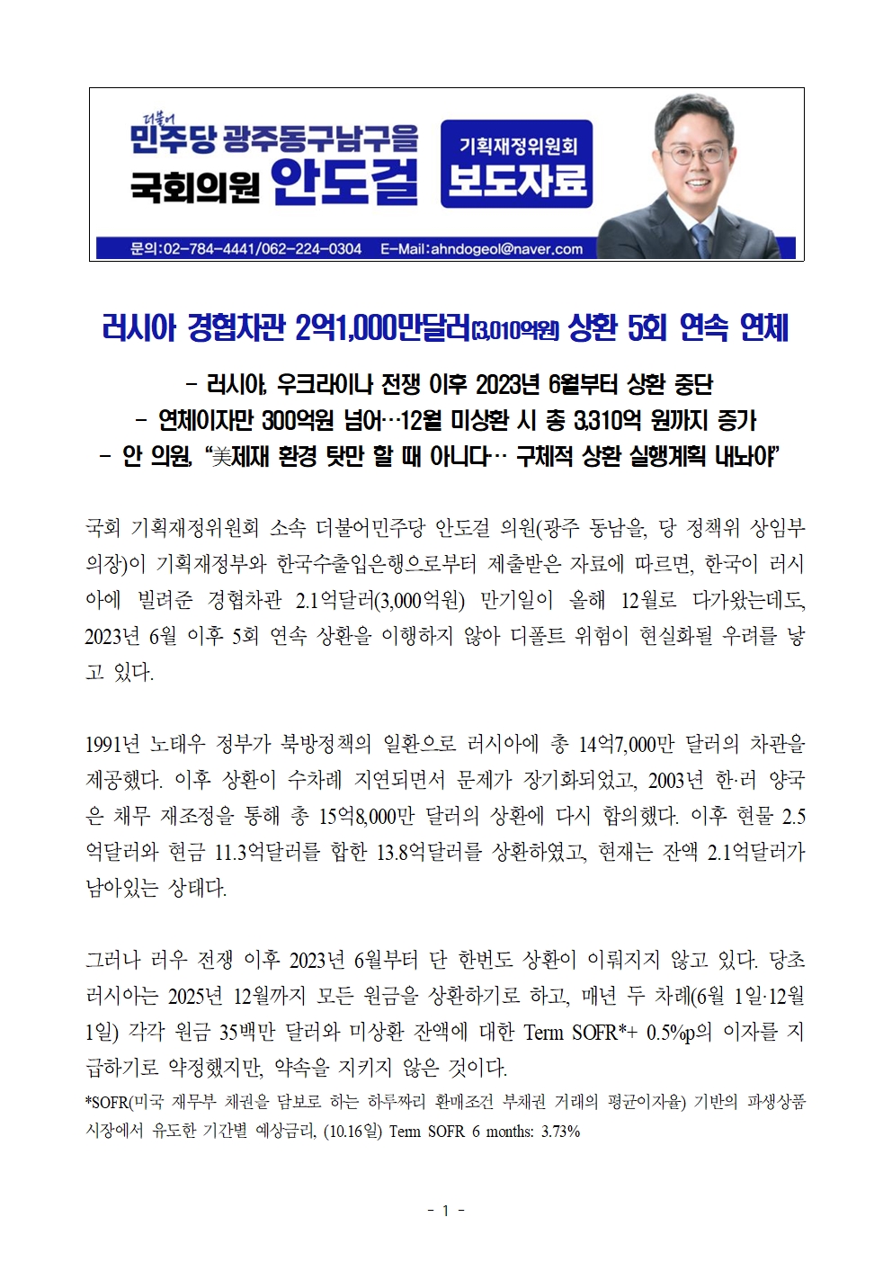 [국회의원 안도걸 보도자료] 러시아 경협차관 2억1,000만달러(3,010억원) 상환 5회 연속 연체