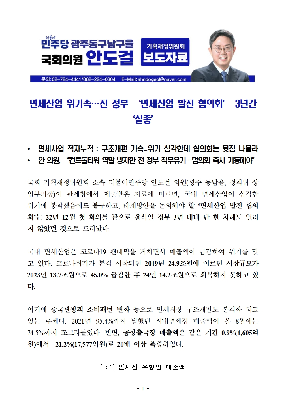 [국회의원 안도걸 보도자료] 면세산업 위기속…전 정부 ‘면세산업 발전 협의회’ 3년간 ‘실종’