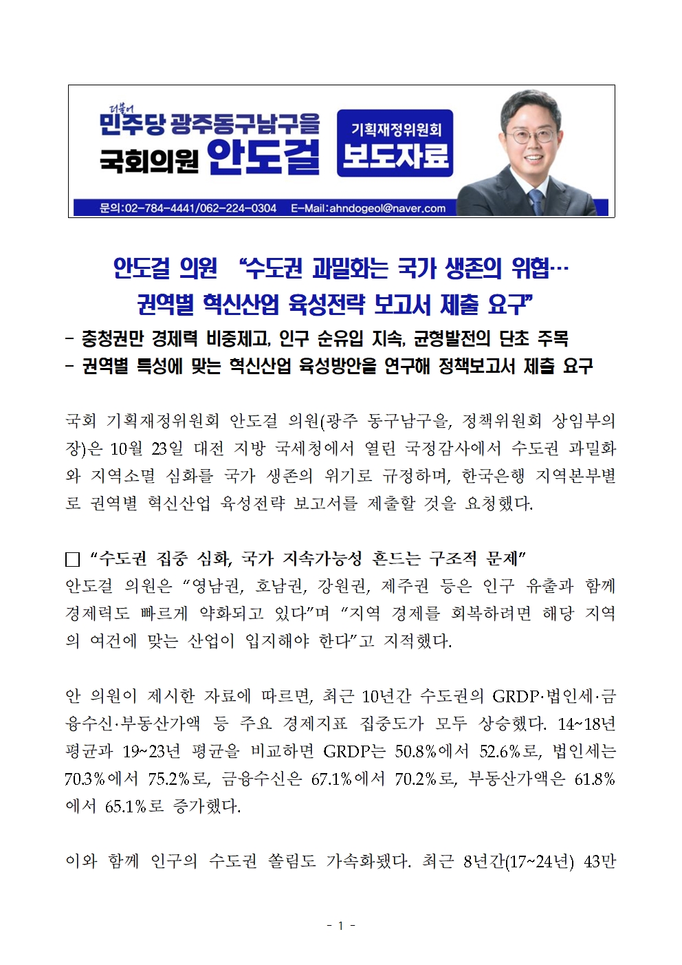 [국회의원 안도걸 보도자료] 수도권 과밀화는 국가 생존의 위협… 권역별 혁신산업 육성전략 보고서 제출요구.hwp