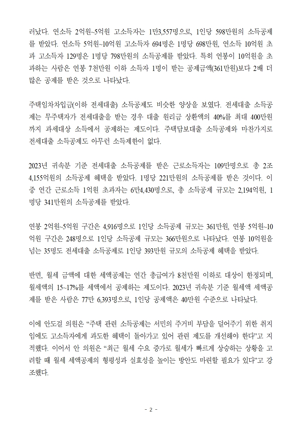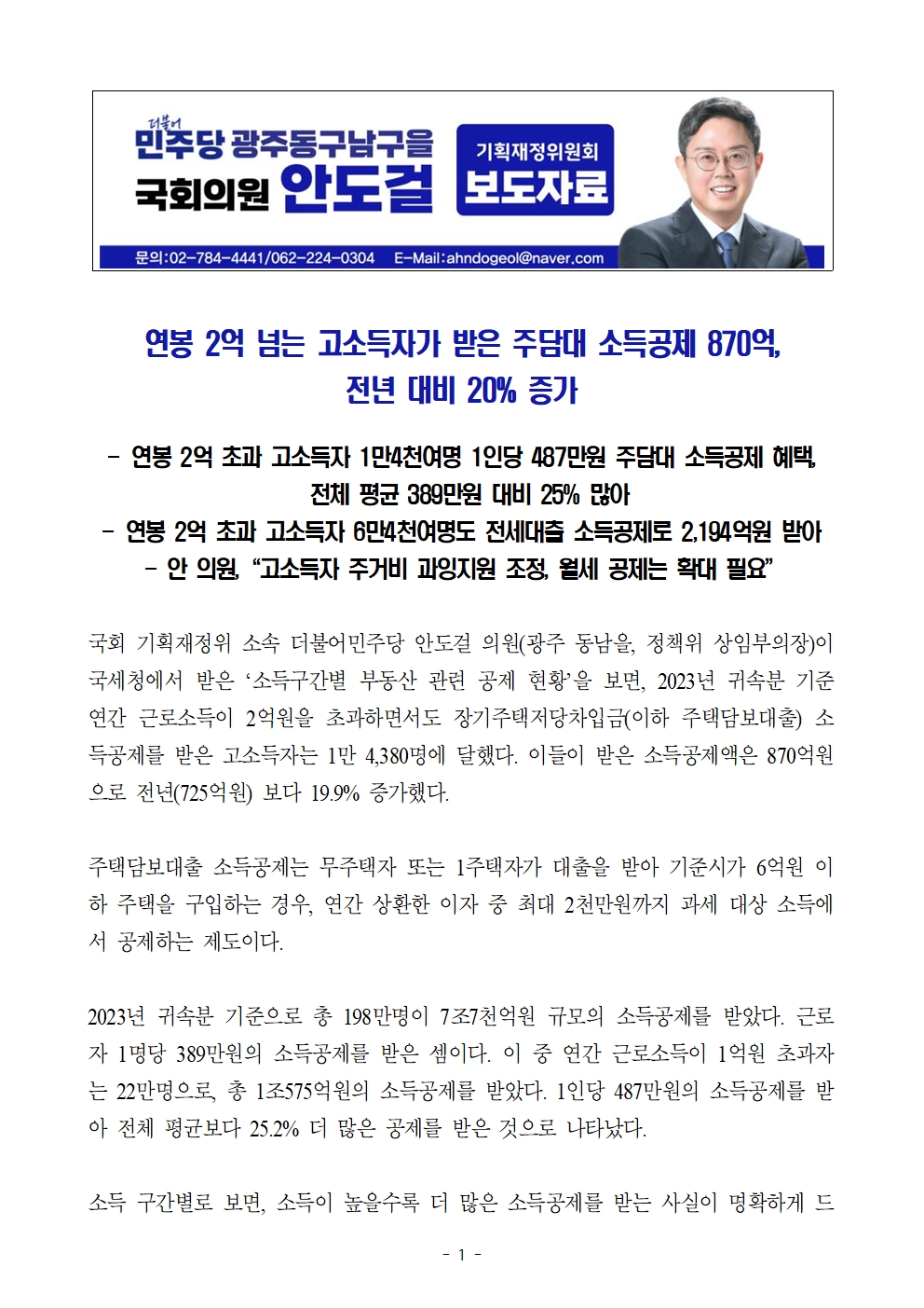 [국회의원 안도걸 보도자료] 연봉 2억 넘는 고소득자가 받은 주담대 소득공제 870억, 전년대비 20% 증가