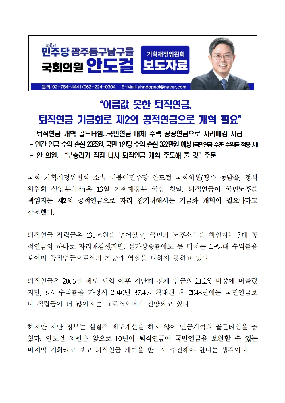 [국회의원 안도걸 보도자료] 이름값 못한 퇴직연금, 퇴직연금 기금화로 제2의 공적연금으로 개혁 필요