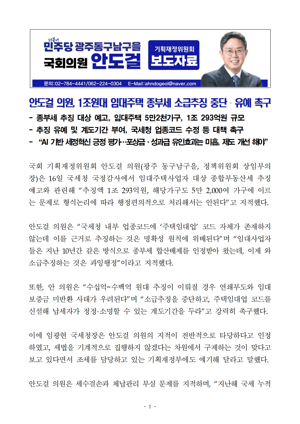 [국회의원 안도걸 보도자료] 1조원대 임대주택 종부세 소급추진 중단 촉구