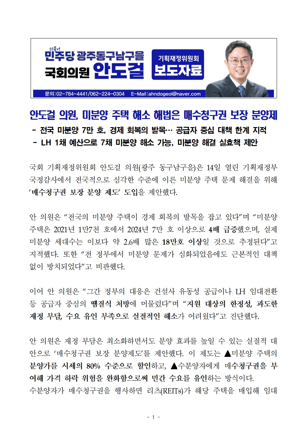 [국회의원 안도걸 보도자료] 미분양 주택 해소 해법은 매수청구권 보장 분양제
