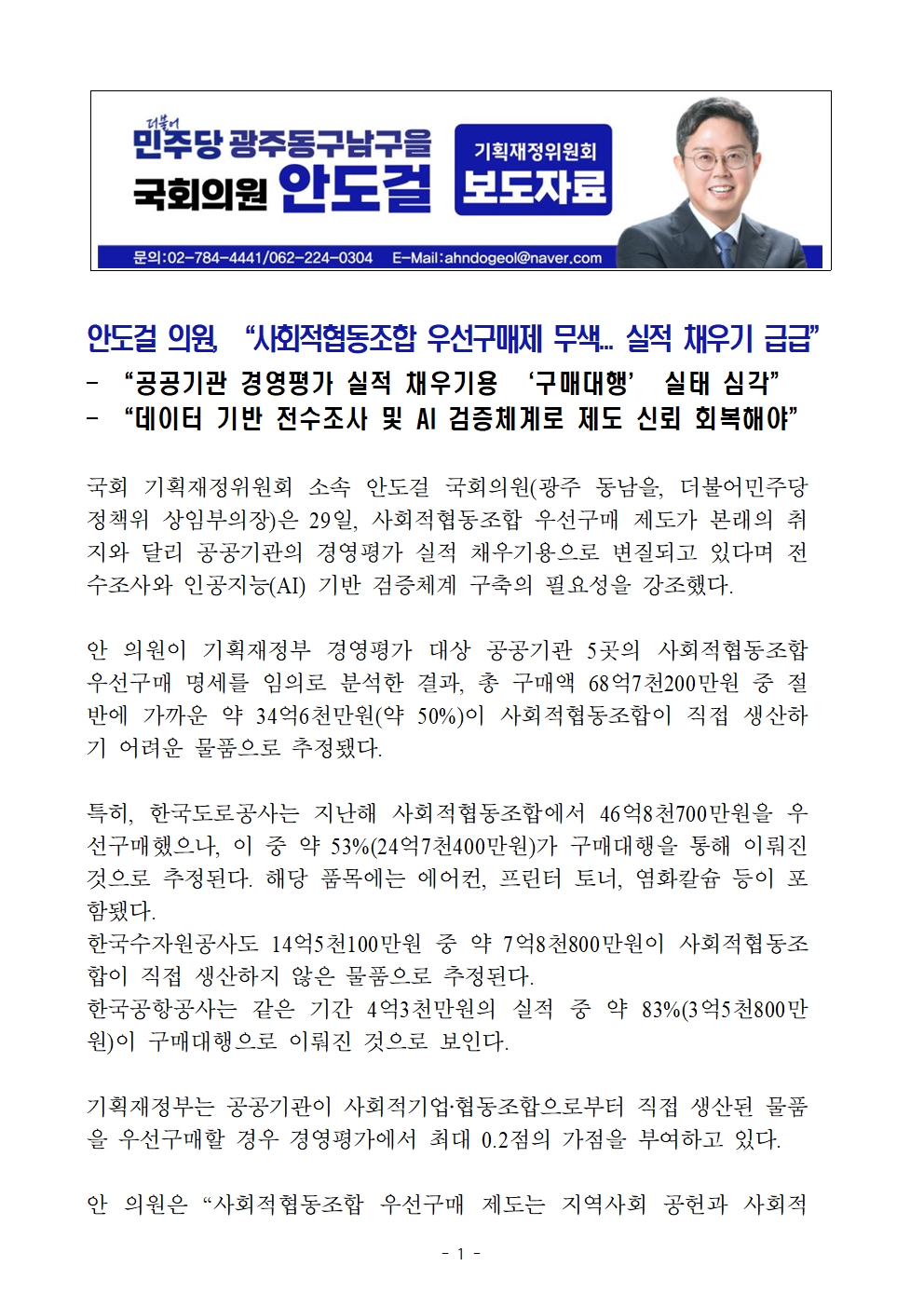 [국회의원 안도걸 보도자료] 사회적협동조합 우선구매제 무색... 실적 채우기 급급