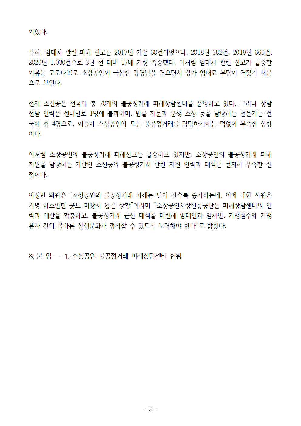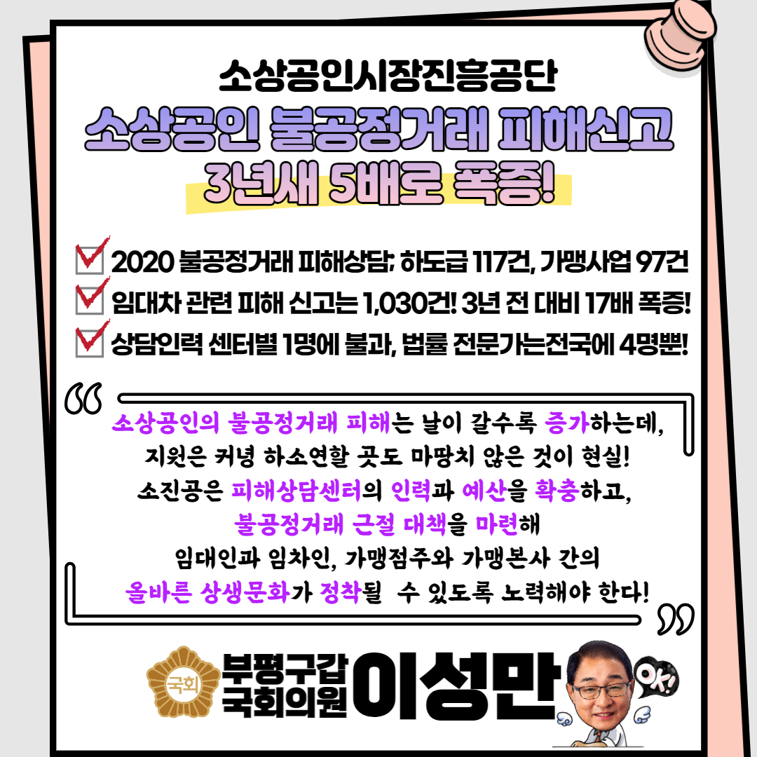 [국회의원 이성만] 소상공인 불공정거래 피해신고 1,500건... 3년새 5배로 폭증