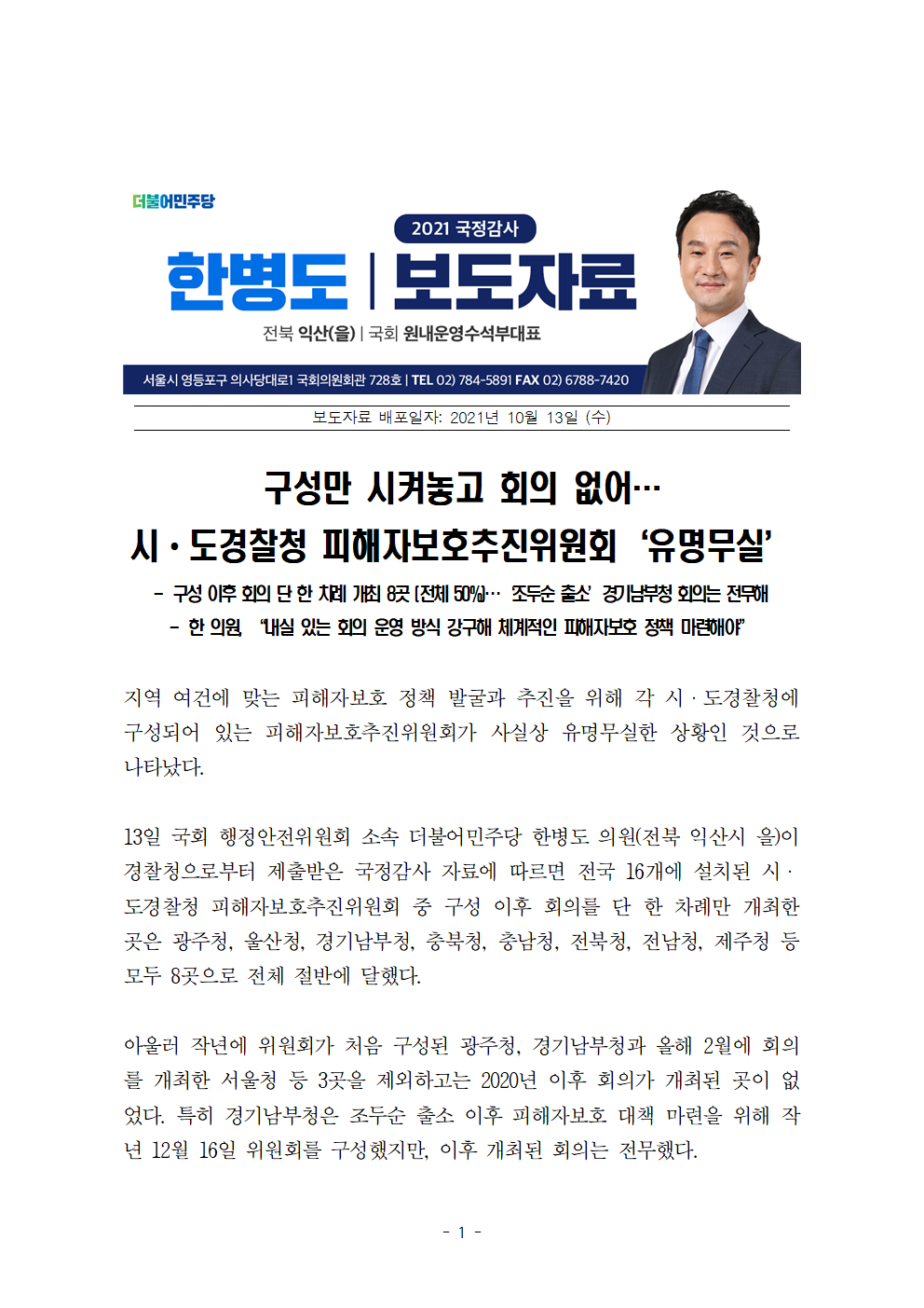 한병도_의원2021_행안위_국정감사_보도자료(25)_구성만시켜놓고회의없어…시ㆍ도경찰청피해자보호추진위원회‘유명무실’.hwp