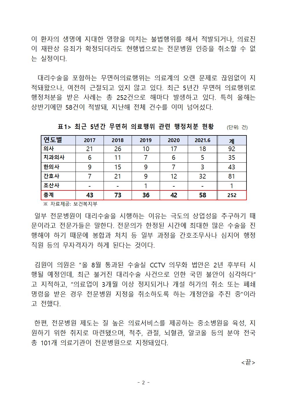 김원이의원_보도자료_11번_수술실_CCTV_의무설치_2년_남았는데____행정직원이_대리수술해도_‘전문병원’_간판_못_뗀다_211005.hwp