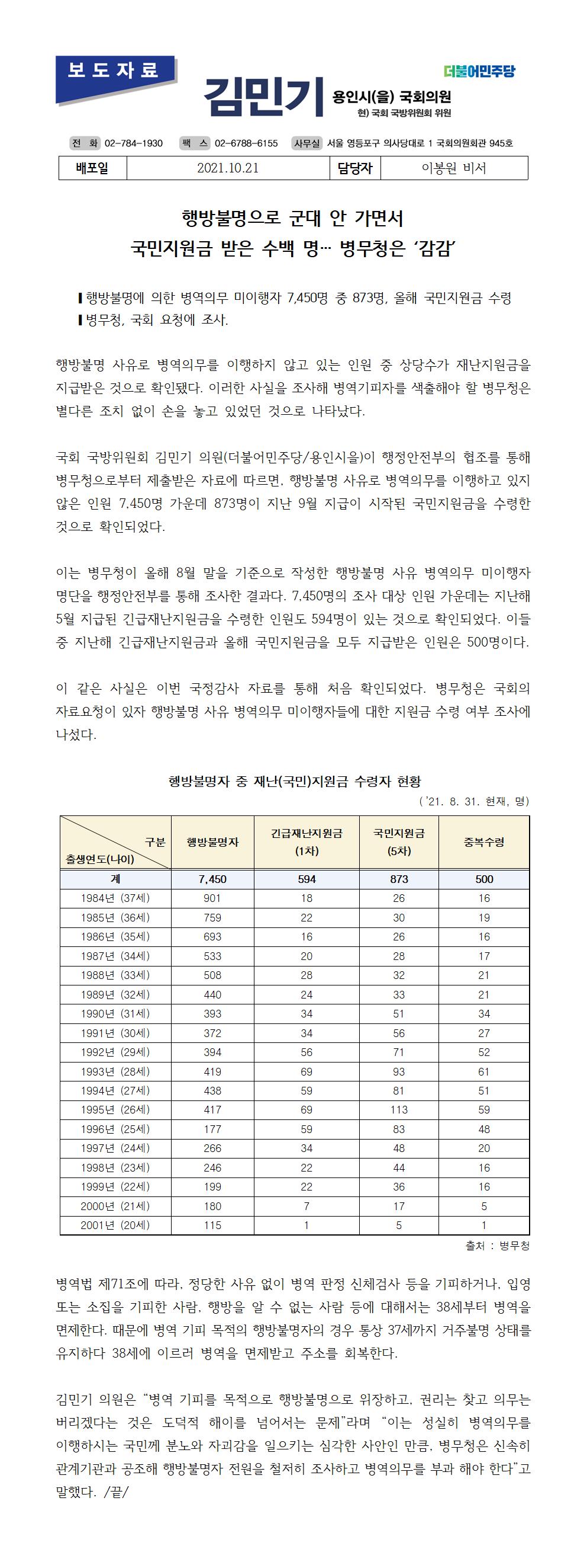 [국회의원 김민기] 행방불명으로 군대 안 가면서 국민지원금 받은 수백 명… 병무청은 ‘감감’