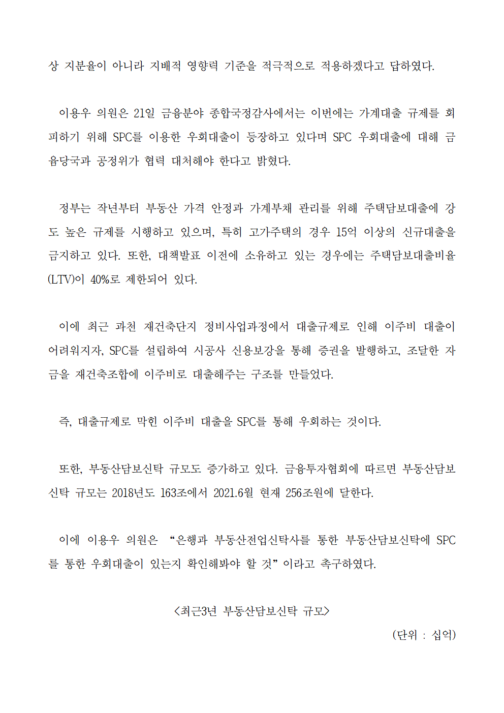 [국회의원 이용우] 이용우 의원, SPC 및 신탁 이용한 우회대출 관리감독 해야