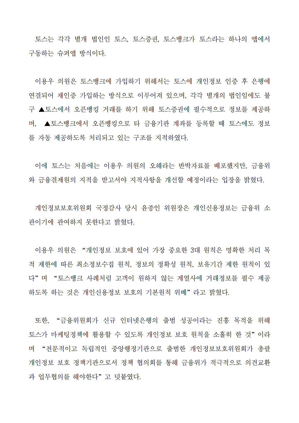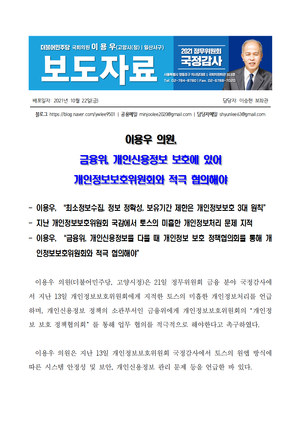 [국회의원 이용우] 금융위, 개인신용정보 보호에 있어 개인정보보호위원회와 적극 협의해야