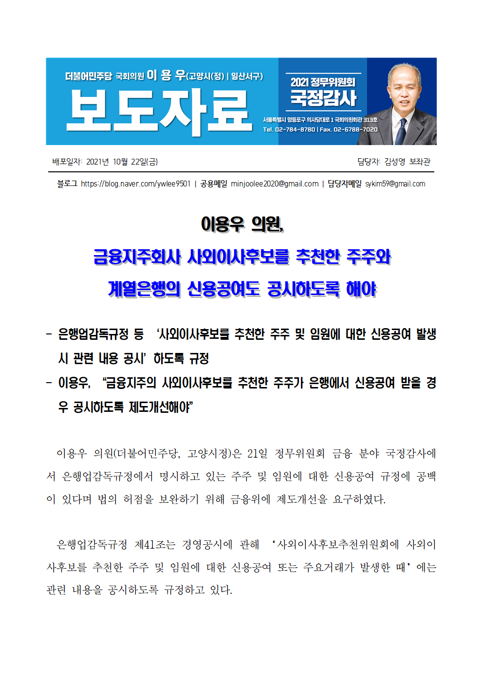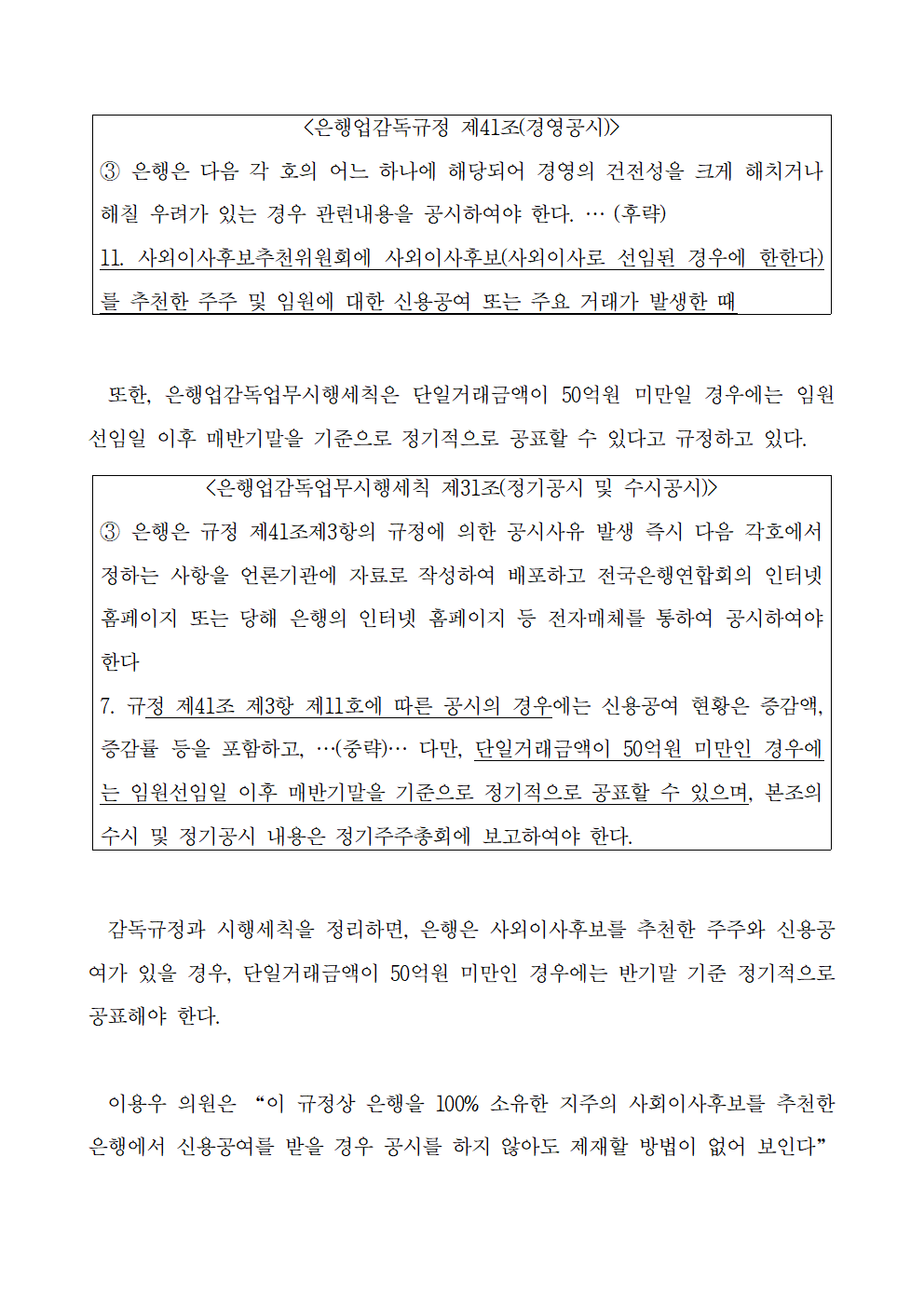 [국회의원 이용우] 금융지주회사 사외이사 후보를 추천한 주주와 계열은행의 신용공여도 공시하도록 해야