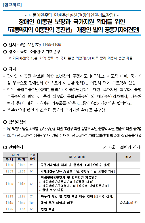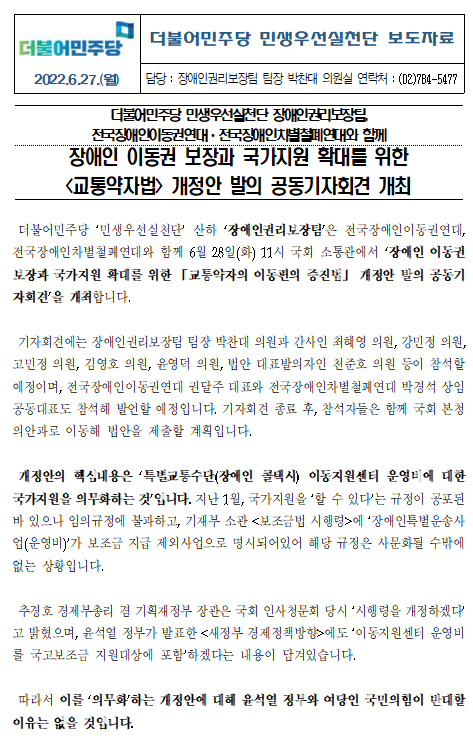 [보도자료] 더불어민주당 민생우선실천단, 장애인 이동권 보장과 국가지원 확대를 위한 교통약자법 개정안 발의 공동기자회견 개최