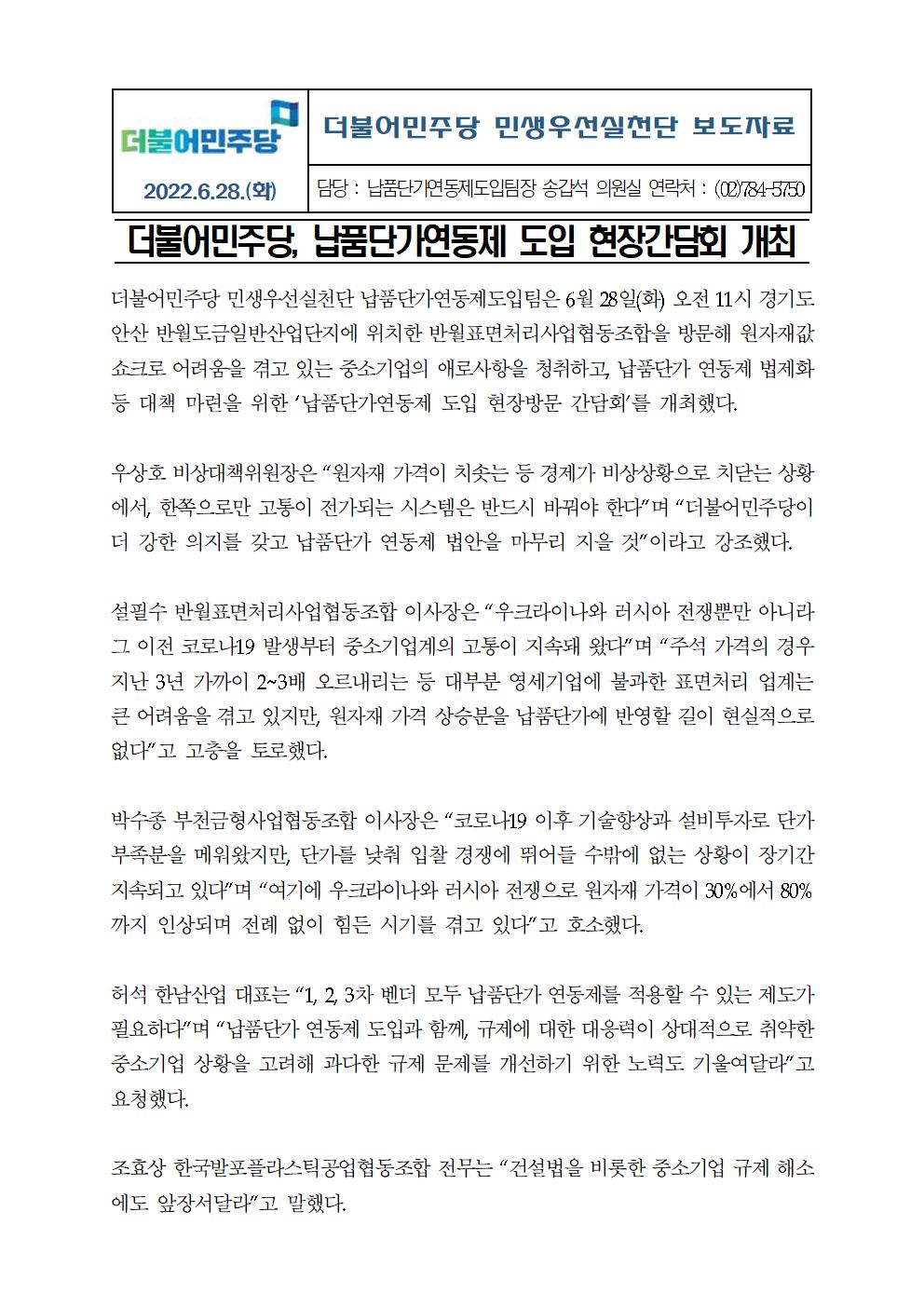 [보도자료] 더불어민주당 민생우선실천단, 납품단가연동제 도입 현장간담회 개최