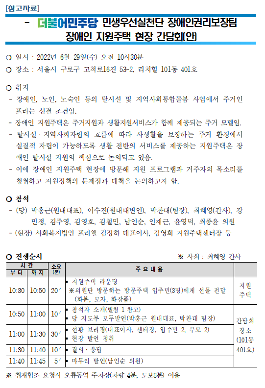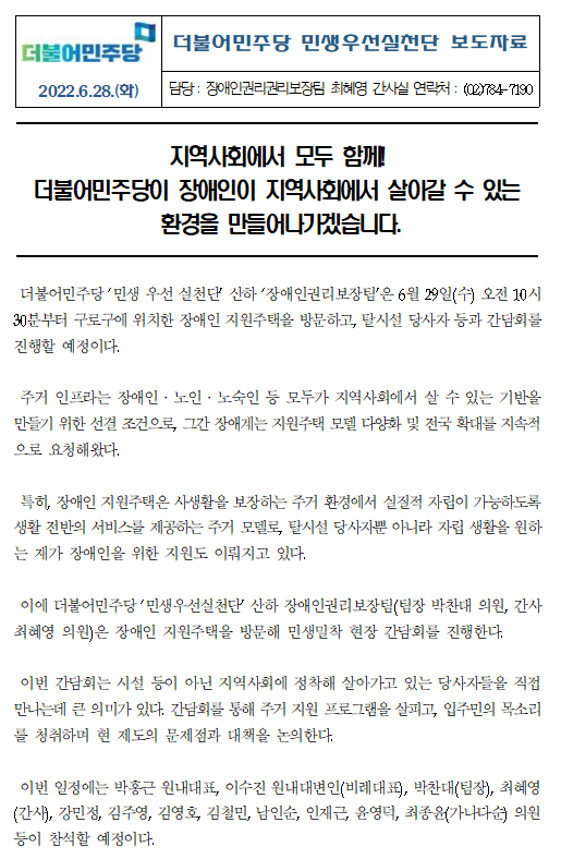 [보도자료] 더불어민주당 민생우선실천단, 장애인 지원주택 현장 간담회 진행 예정
