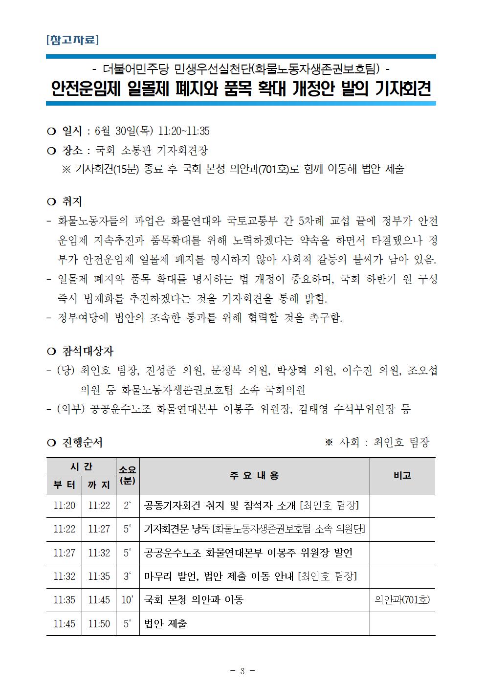 [보도자료] 더불어민주당 민생우선실천단, 안전운임제 일몰제 폐지와 품목 확대를 위한 '화물자동차 운수사업법' 개정안 발의 공동기자회견 개최