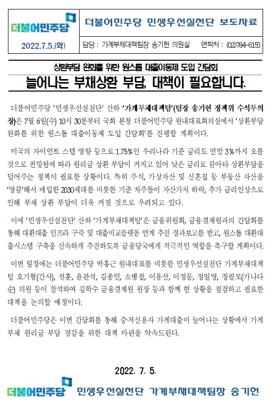 [보도자료] 더불어민주당 민생우선실천단, 상환부담 완화를 위한 원스톱 대출이동제 도입 간담회 개최