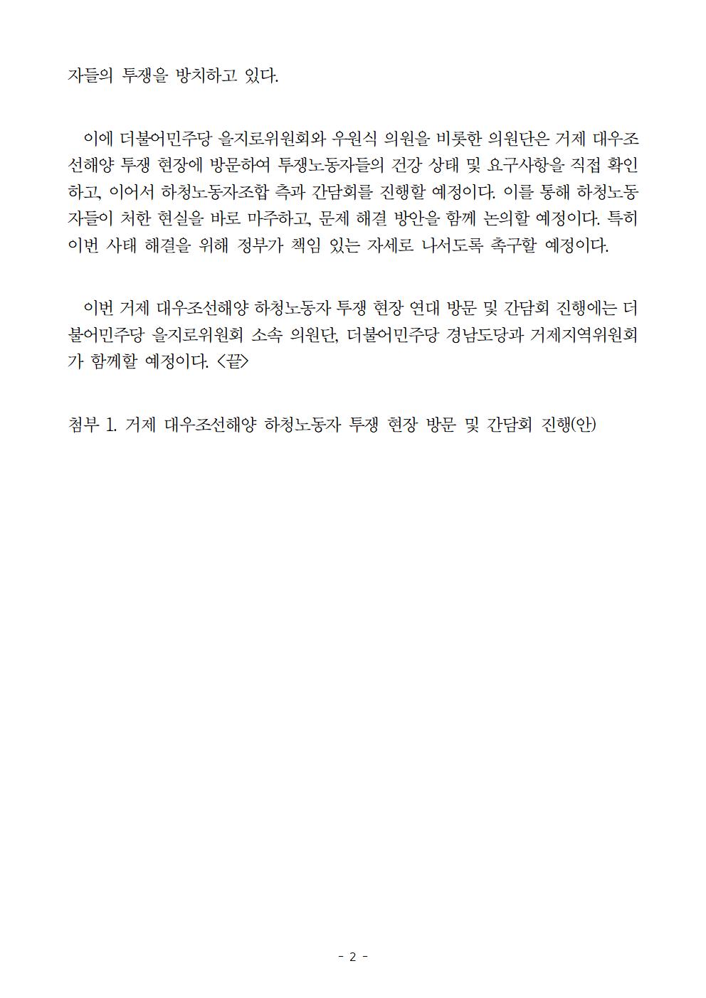 [보도자료] 더불어민주당 을지로위원회와 의원단, 거제 대우조선해양 하청노동자 투쟁 현장 방문 및 간담회 진행