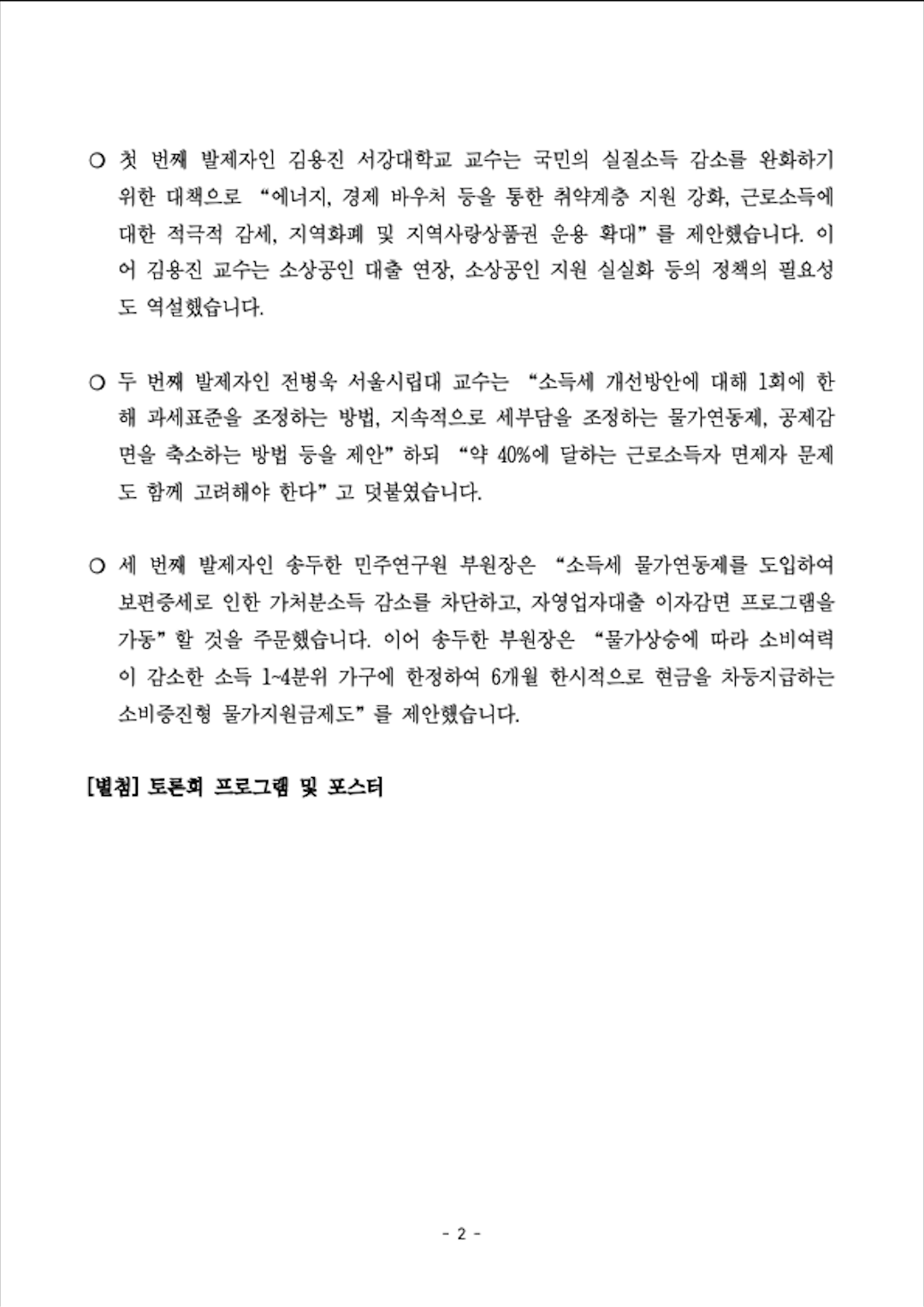 [보도자료]민주연구원 민생물가 대책 및 소득보전 방안 정책토론회 개최