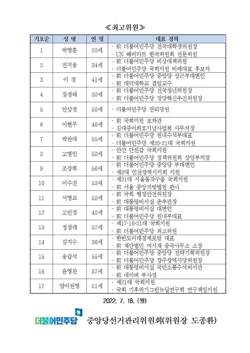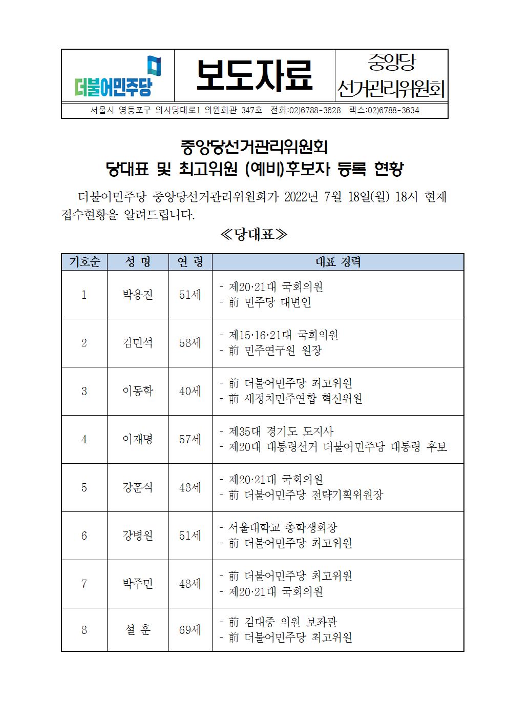 [보도자료] 중앙당선거관리위원회 당대표 및 최고위원 (예비)후보자 등록 현황