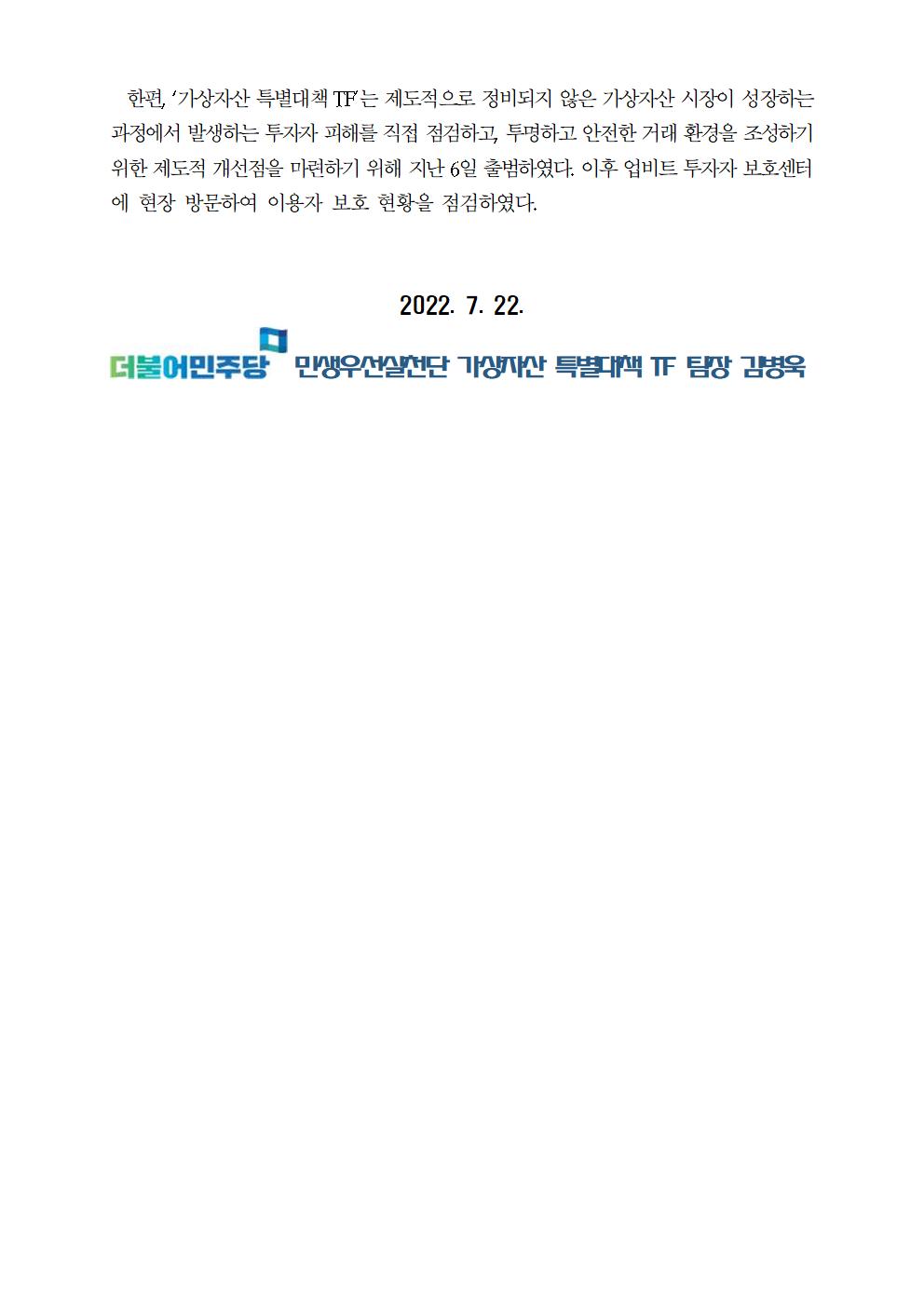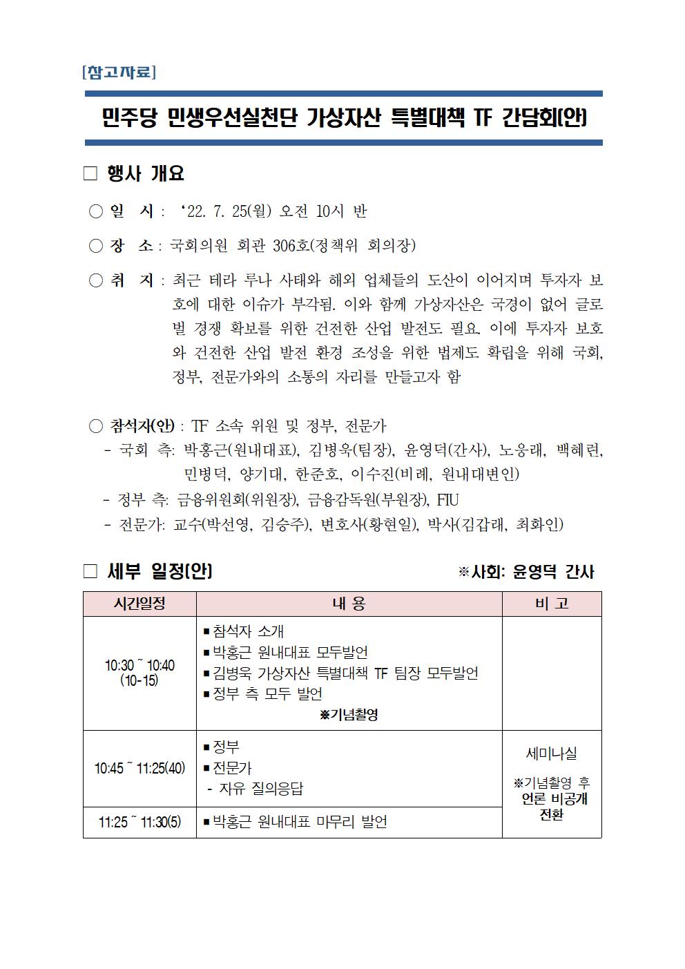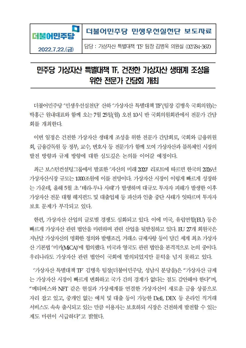 [보도자료] 더불어민주당 가상자산 특별대책TF, 건전한 가상자산 생태계 조성을 위한 전문가 간담회 개최