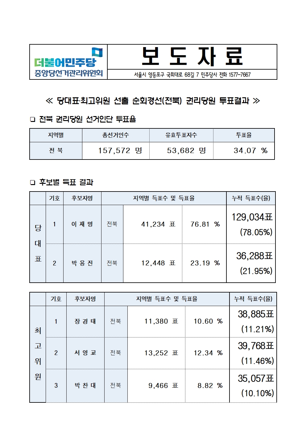 [보도자료] 당대표‧최고위원 선출 순회경선(전북) 권리당원 투표결과