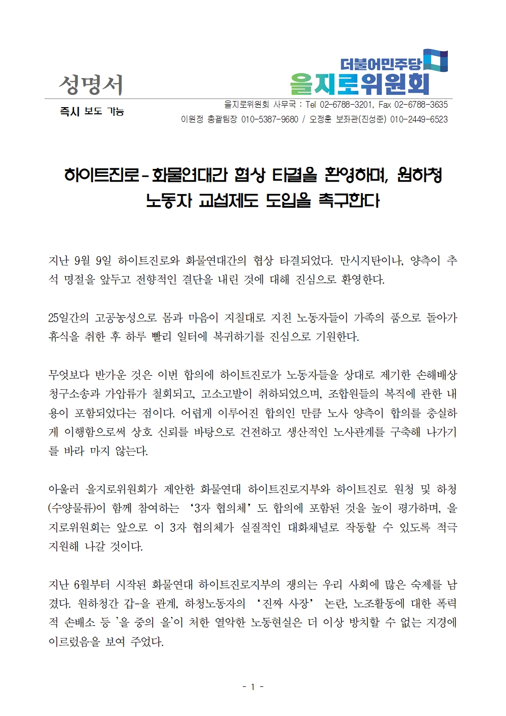 [성명서] 더불어민주당 을지로위원회, 하이트진로-화물연대간 협상 타결 환영, 원하청 노동자 교섭제도 도입 촉구