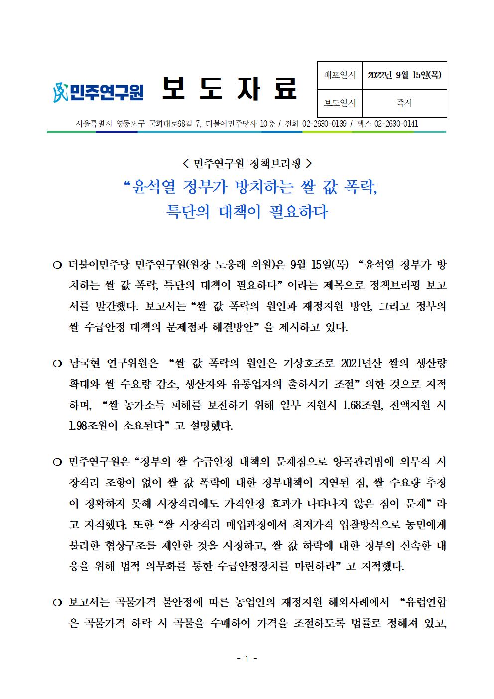 [보도자료] 더불어민주당 민주연구원, '윤석열 정부가 방치하는 쌀 값 폭락, 특단의 대책이 필요하다' 정책브리핑 발간