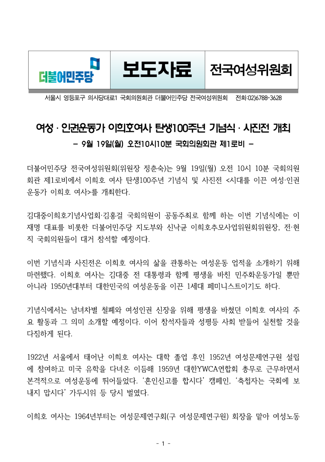 [보도자료]여성·인권운동가 이희호여사 탄생100주년 기념식·사진전 개최