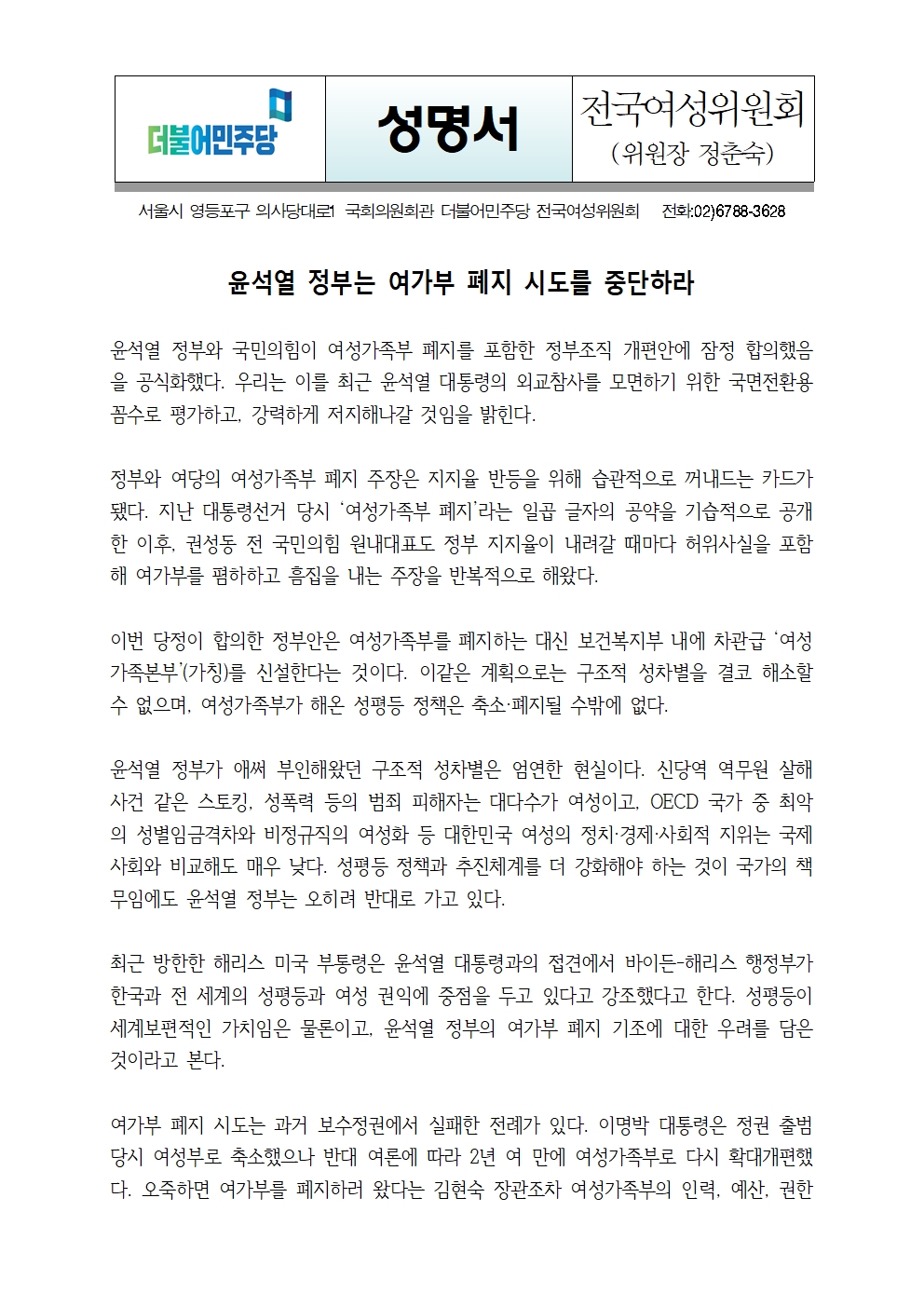 [성명서] 더불어민주당 전국여성위원회, 윤석열 정부는 여가부 폐지 시도를 중단하라