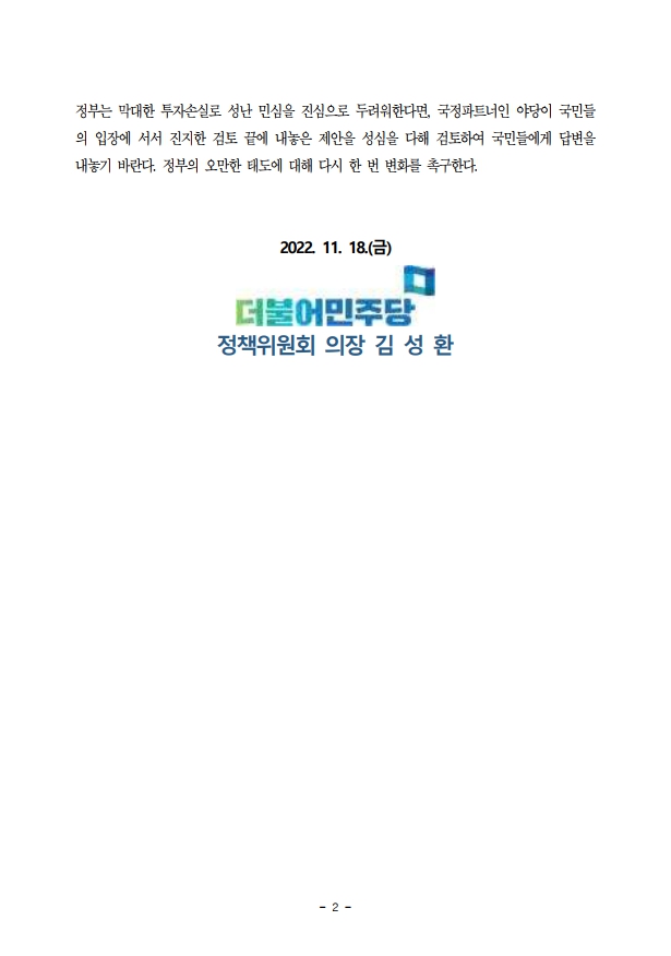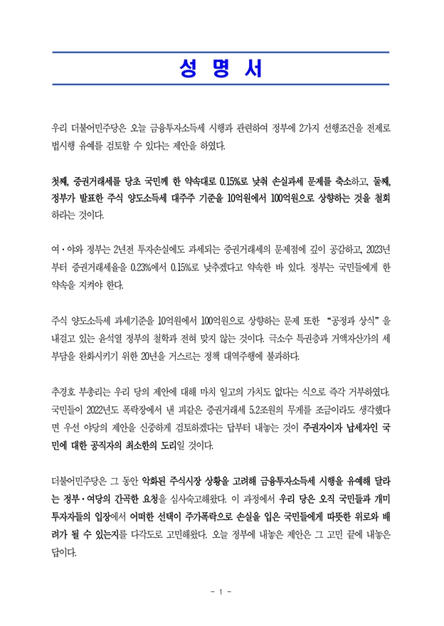 [성명서] 더불어민주당 정책위원회, 정부의 증권거래세 인하 거부 관련 입장 발표