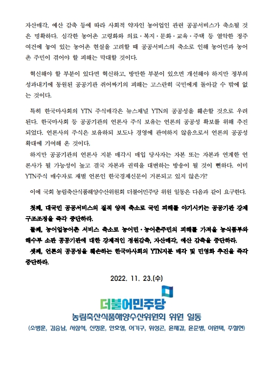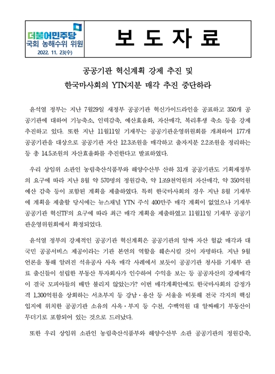 [성명서] 더불어민주당 농림축산식품해양수산위원회 위원, 공공기관 혁신계획 강제 추진 및 한국마사회의 YTN지분 매각 추진 중단하라