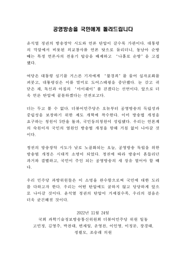 [기자회견문] 국회 과방위원회 더불어민주당 의원 일동, 공영방송을 국민께 돌려드립니다